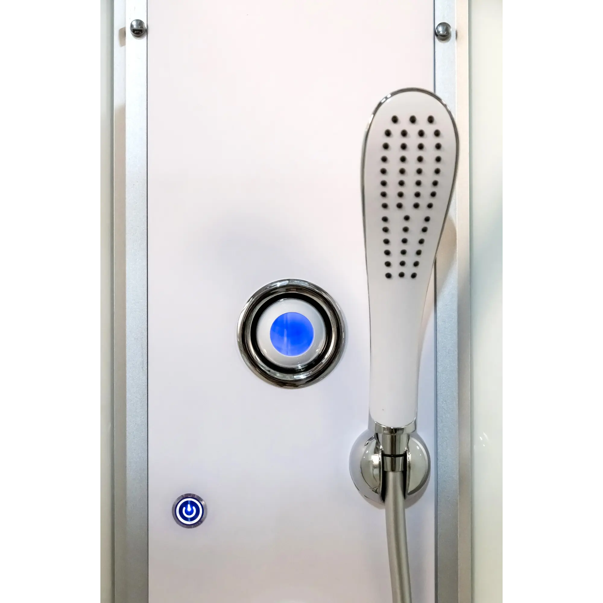 - Стильный дизайн. Устройство гармонично вписывается в интерьер любой душевой кабины, имеет встроенную Led подсветку, добавляя ей функциональности и элегантности.
