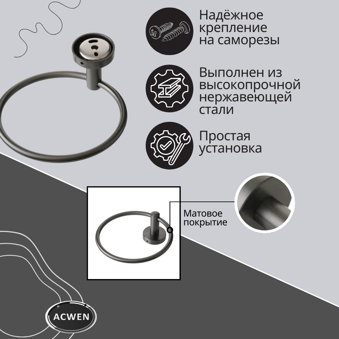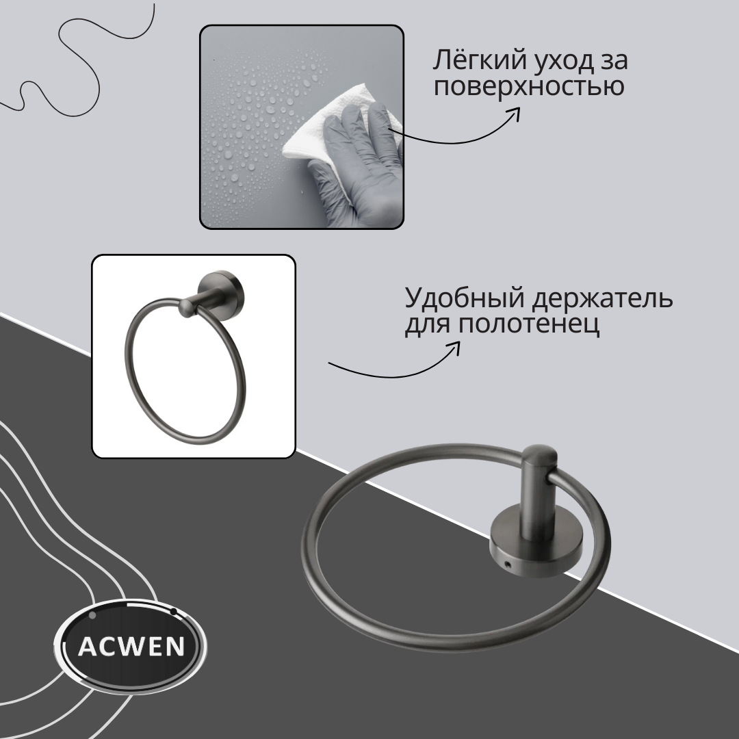 Держатель для полотенец ACWEN в классическом графитовом исполнении добавляет элегантности ванной комнате. Изготовлен из прочной нержавеющей стали, он устойчив к коррозии и сохраняет привлекательный вид даже в условиях высокой влажности. Простая форма кольца обеспечивает удобное размещение полотенец, а универсальный дизайн легко впишется в любой интерьер.