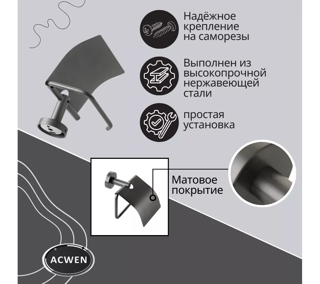 Держатель для туалетной бумаги ACWEN в графитовом исполнении сочетает современный дизайн и функциональность. Изготовлен из прочного материала, который обеспечивает долговечность даже при интенсивном использовании. Компактная конструкция легко монтируется на стену и удерживает рулоны различных размеров без скольжения.