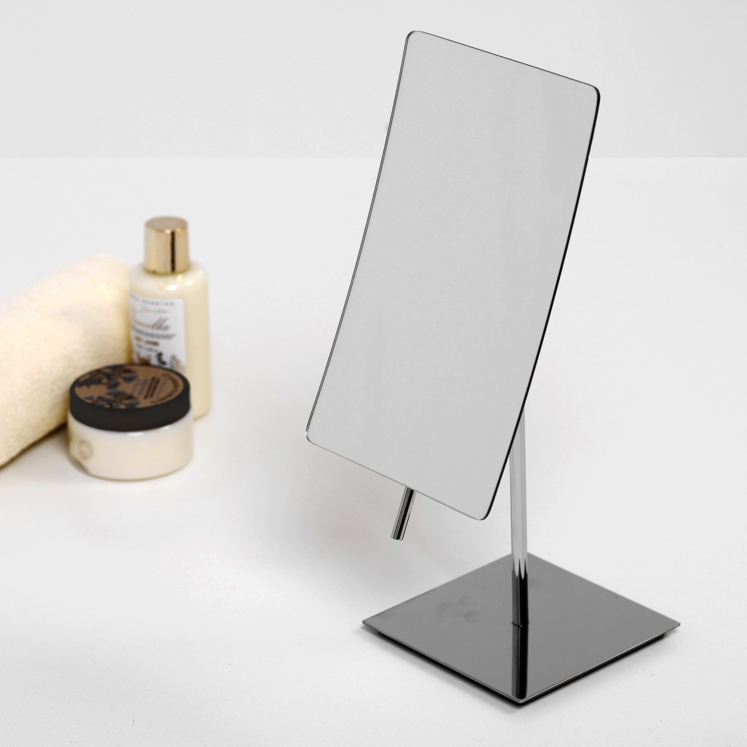 Зеркало является необходимым предметом в ванной комнате. Мы предлагаем двухстороннее зеркало (с одной стороны стандартное зеркало с другой стороны зеркало с 3-х кратным увеличением). Благодаря конструкции зеркала, вы можете его разместить так, как вам будет удобно. Зеркало вращается на 360 градусов по вертикали и горизонтали, что позволяет регулировать угол наклона зеркала и легко развернуть к себе нужной стороной. Также при помощи складной шарнирной ножки зеркало можно приблизить к лицу или убрать к стене.