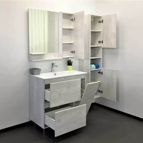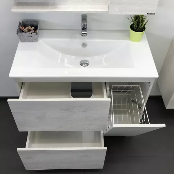 - Современная тумба-умывальник шириной 77 см с двумя объемными выкатными ящиками для хранения принадлежностей для умывания и бытовой химии. Ящики оснащены направляющими с механизмом плавного закрывания. Фасады и корпус из влагостойкого ЛДСП модного цвета дуб белый имитирующего бетон.Габариты (ШхВхГ): 770*870*470 мм
