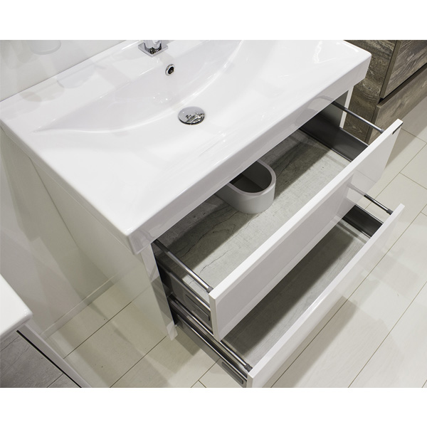 Современная напольная тумба-умывальник COMFORTY из коллекции 2017. Компактная модель оборудована двумя вместительными выкатными ящиками. Направляющие ящиков оборудованы системой плавного закрывания. Тумба подготовлена для подключения водоснабжения снизу. Корпус тумбы изготовлен из влагостойкого ДСП. Габариты (ШхВхГ): 605*850*460 мм