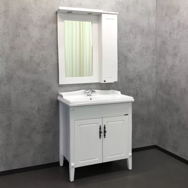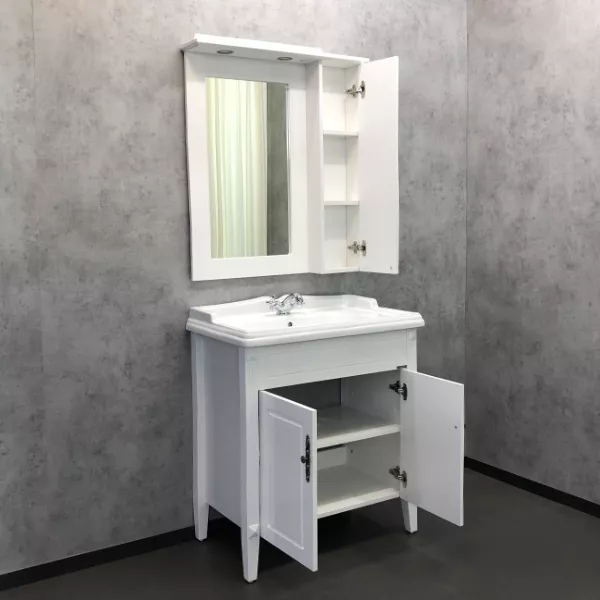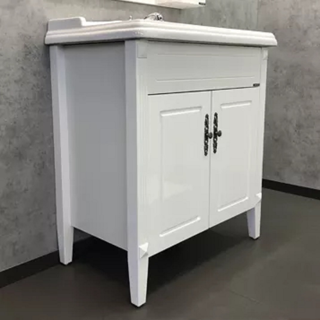 - Напольная тумба с двумя распашными створками, оснащенными петлями с плавным закрыванием. Корпус и фасады из МДФ покрыты белой глянцевой эмалью. Ножки из массива натурального дерева. Тумба подготовлена для подключения водоснабжения снизу. Габариты ШхВхГ: 800*880*490 мм