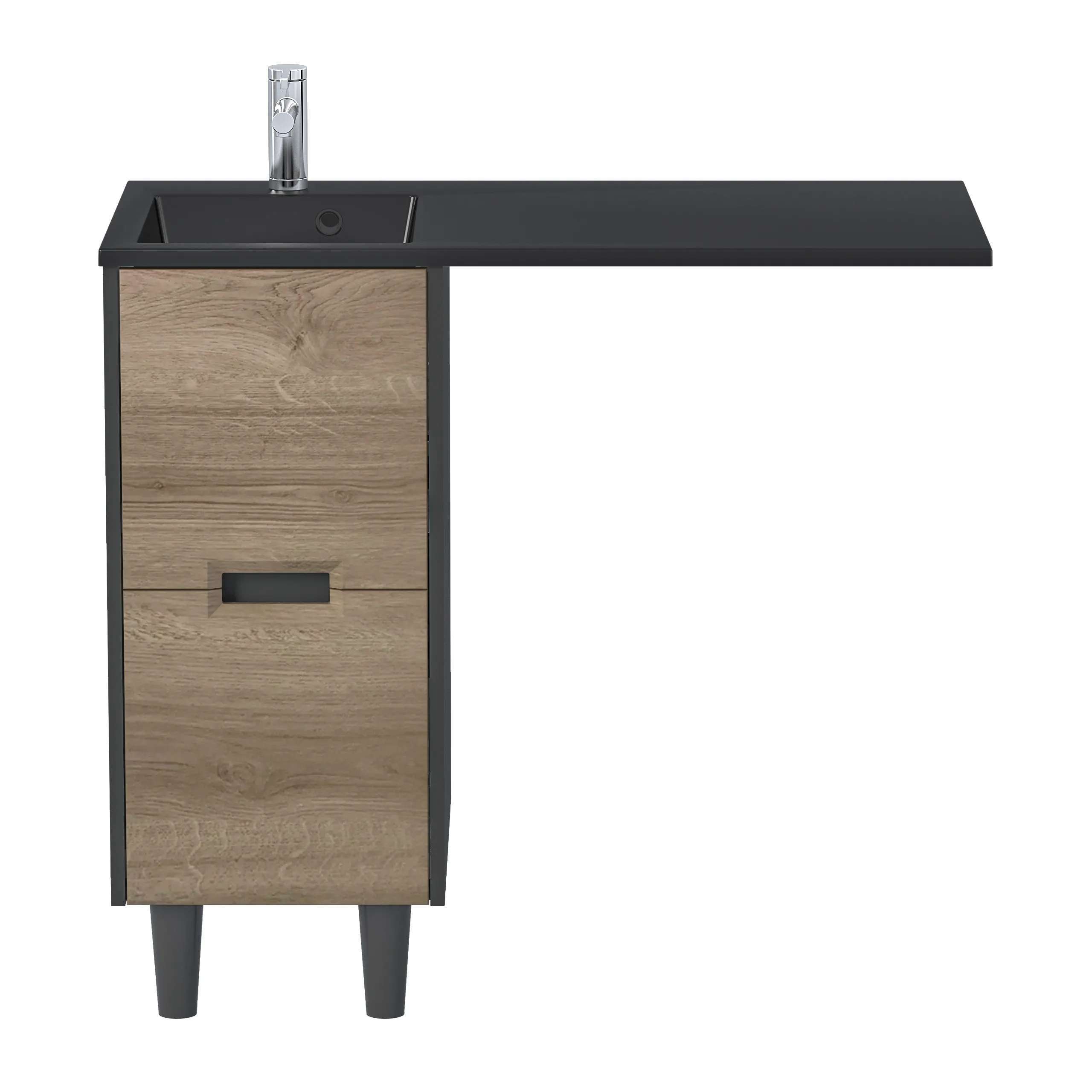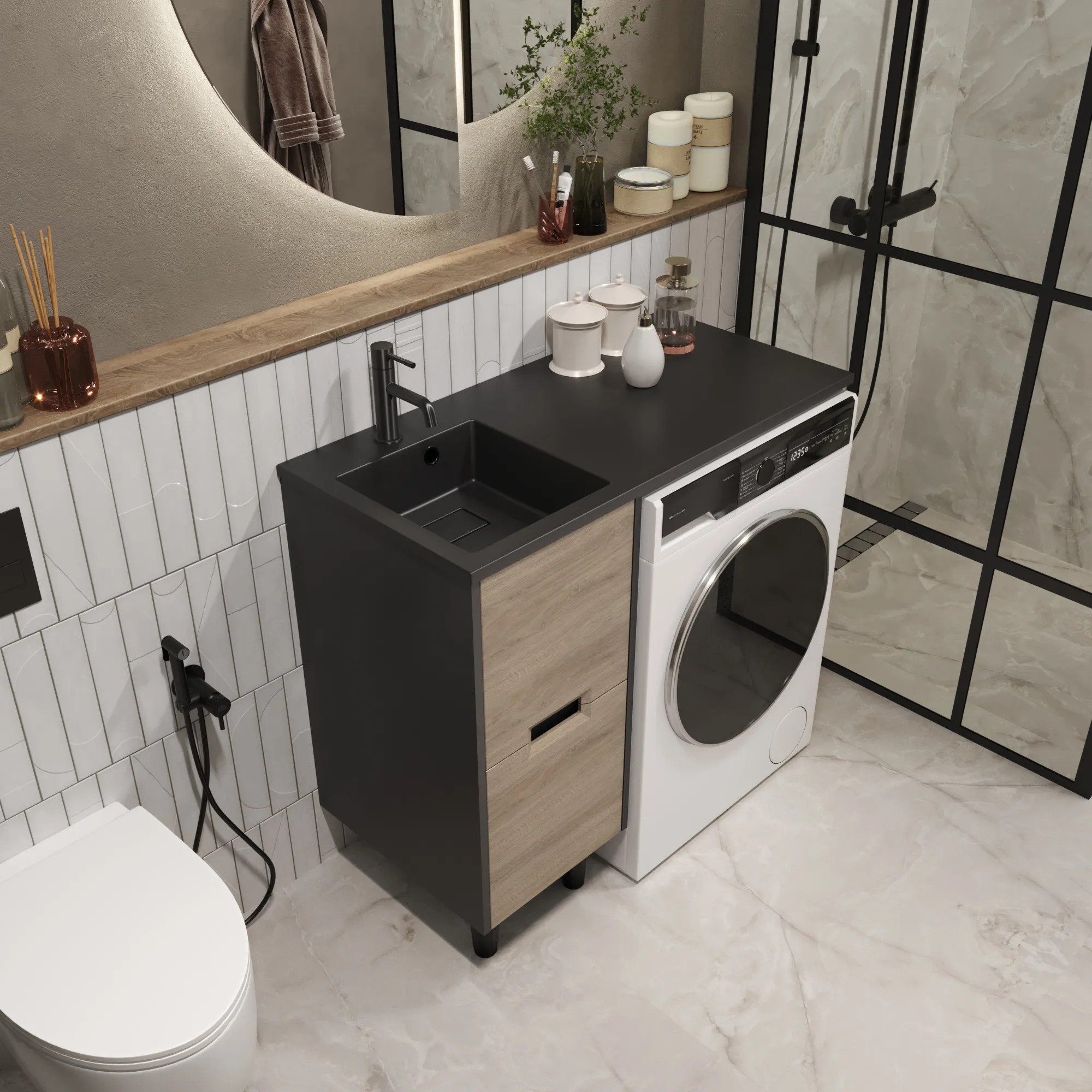 Тумба под раковину* и стиральную машину Maid – элегантное и функциональное решение, она создает гармоничное пространство в ванной комнате. Искусное сочетание антрацита и "ореха лучистого европейского" придает тумбе изысканный вид, а два вместительных ящика помогут легко организовать порядок. Акцентные опоры черного цвета гармонично дополнят ваш выбор: строгая графитовая или нежная белая раковина – для создания неповторимого стиля ванной комнаты.