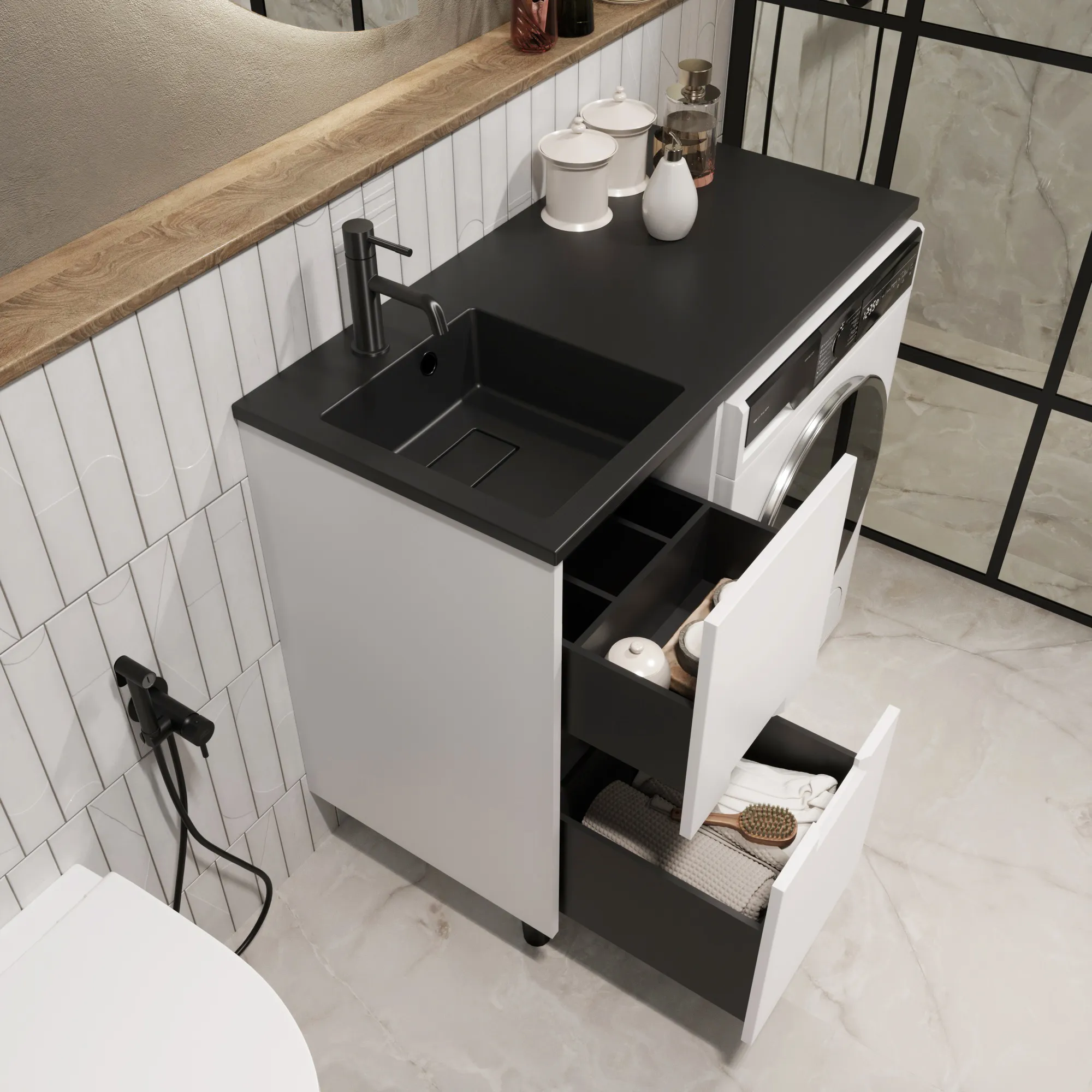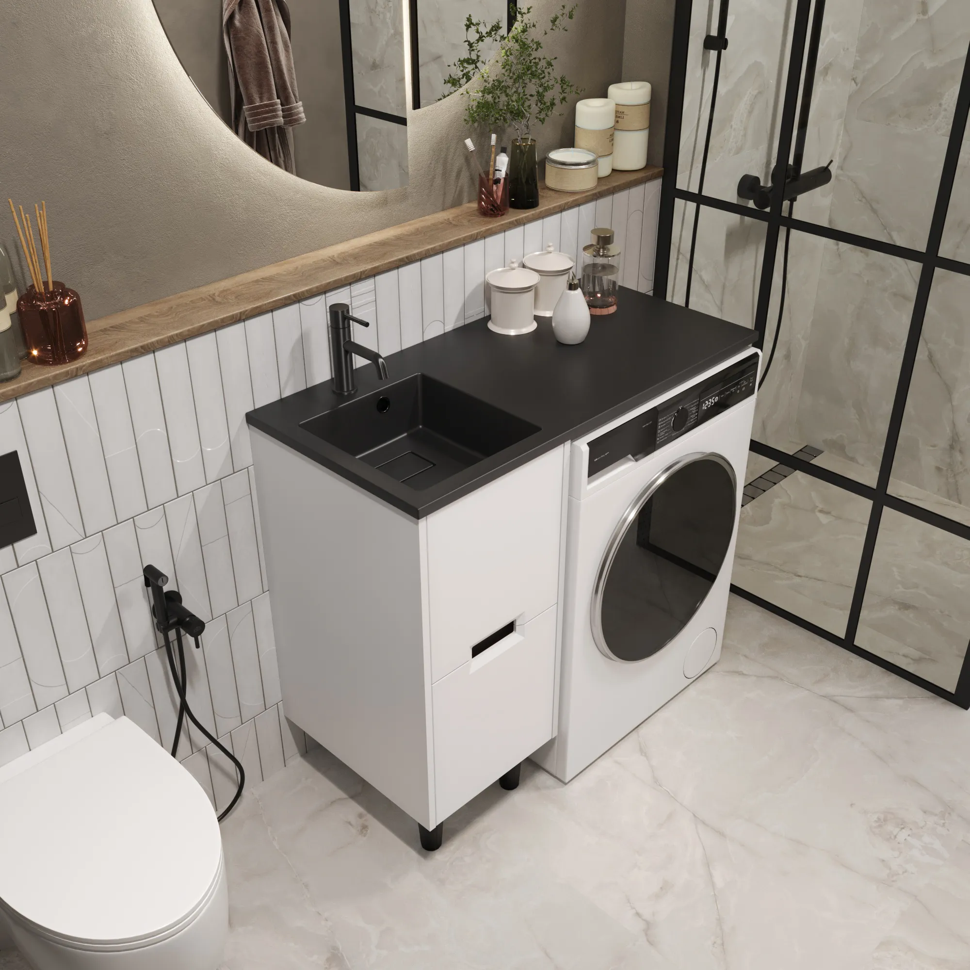 умба под раковину* Maid – элегантное решение "2-в-1", которое объединяет функциональность и стиль, позволяя гармонично разместить раковину и стиральную машину в ванной комнате. Белый цвет легко сочетается с другими цветами и стилями интерьера, предоставляя свободу в оформлении ванной комнаты. Акцентные опоры  черного цвета гармонично дополнят ваш выбор: строгая графитовая или нежная белая раковина – для создания неповторимого стиля ванной комнаты.