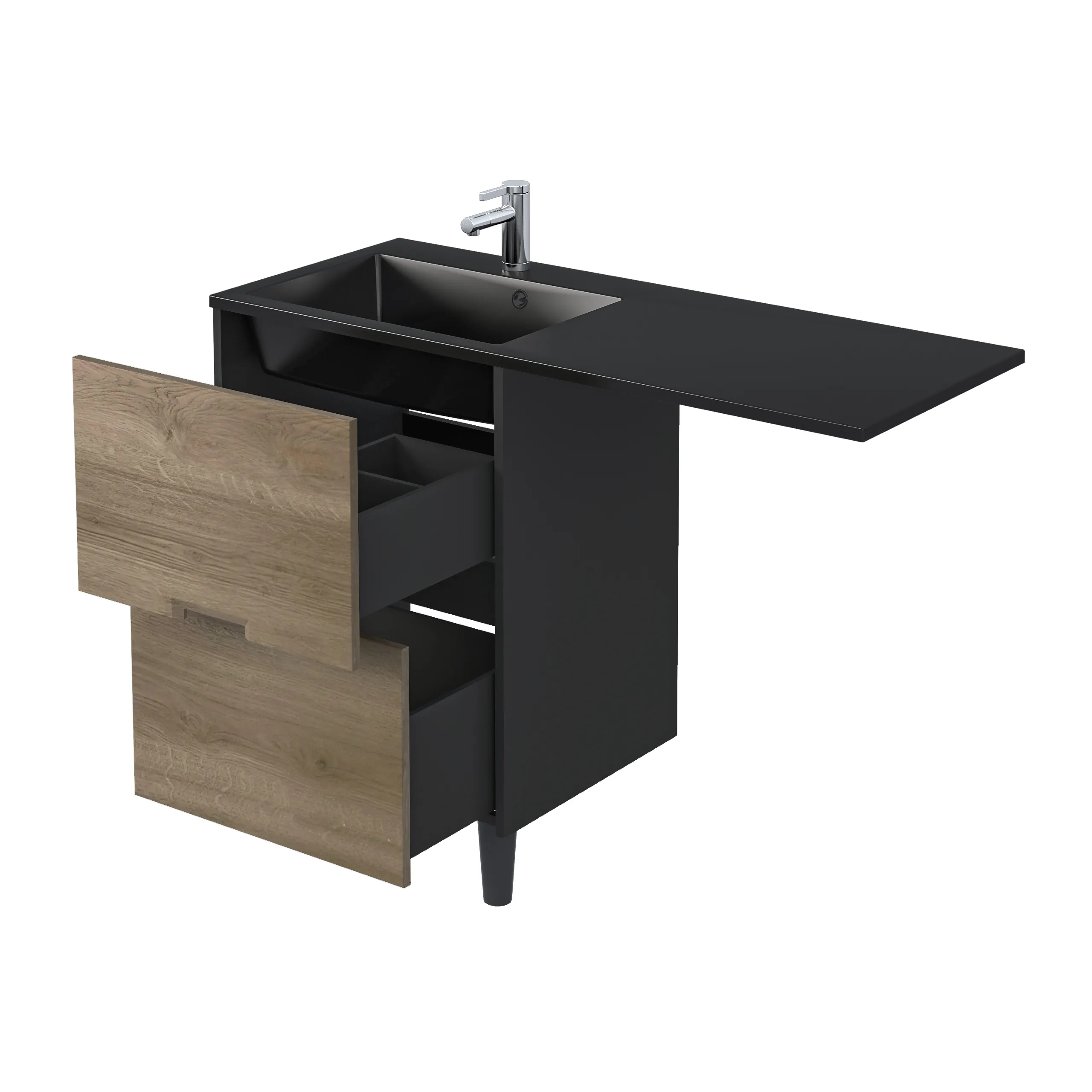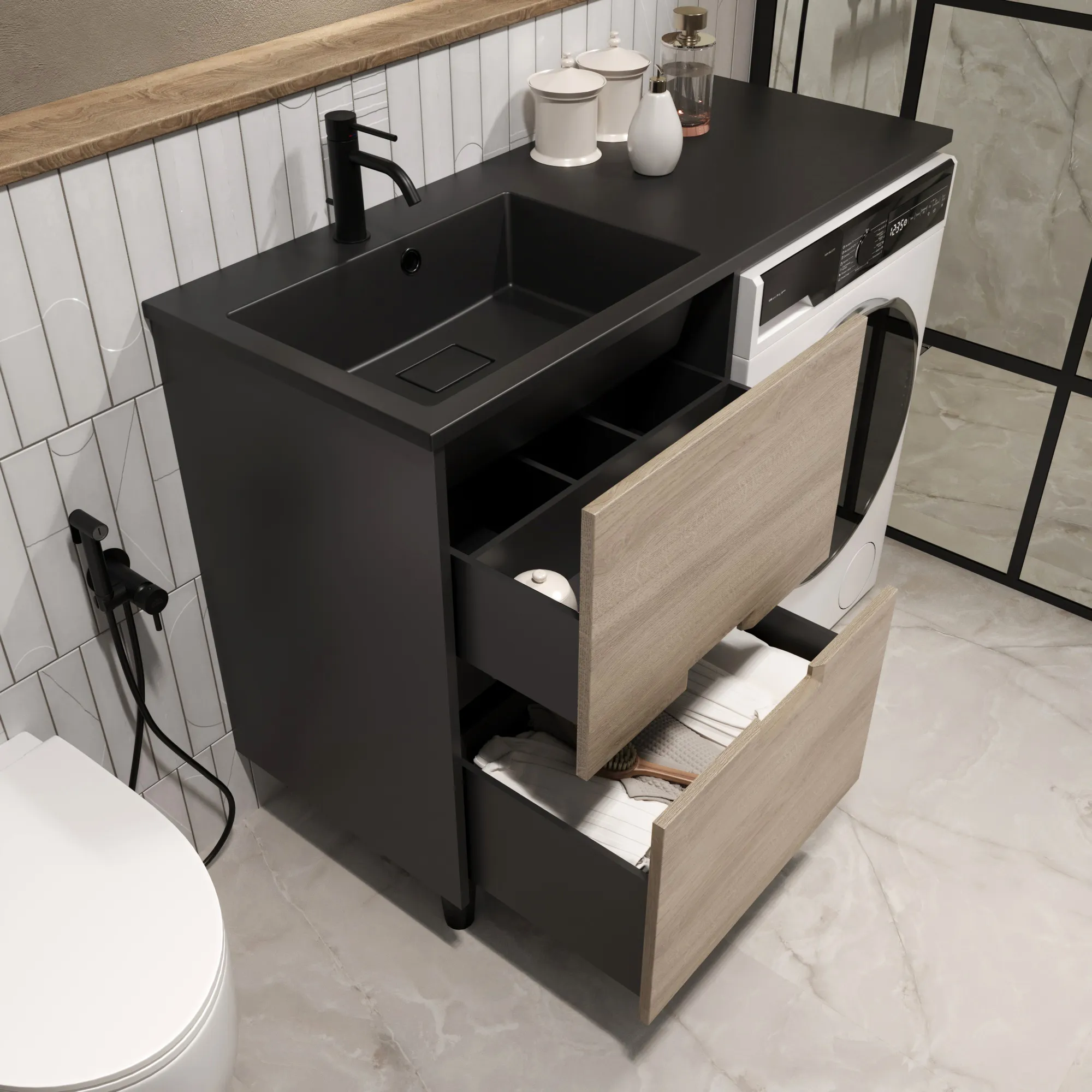 Тумба под раковину* и стиральную машину Maid – элегантное и функциональное решение, она создает гармоничное пространство в ванной комнате. Искусное сочетание антрацита и "ореха лучистого европейского" придает тумбе изысканный вид, а два вместительных ящика помогут легко организовать порядок. Акцентные опоры  черного цвета гармонично дополнят ваш выбор: строгая графитовая или нежная белая раковина – для создания неповторимого стиля ванной комнаты.