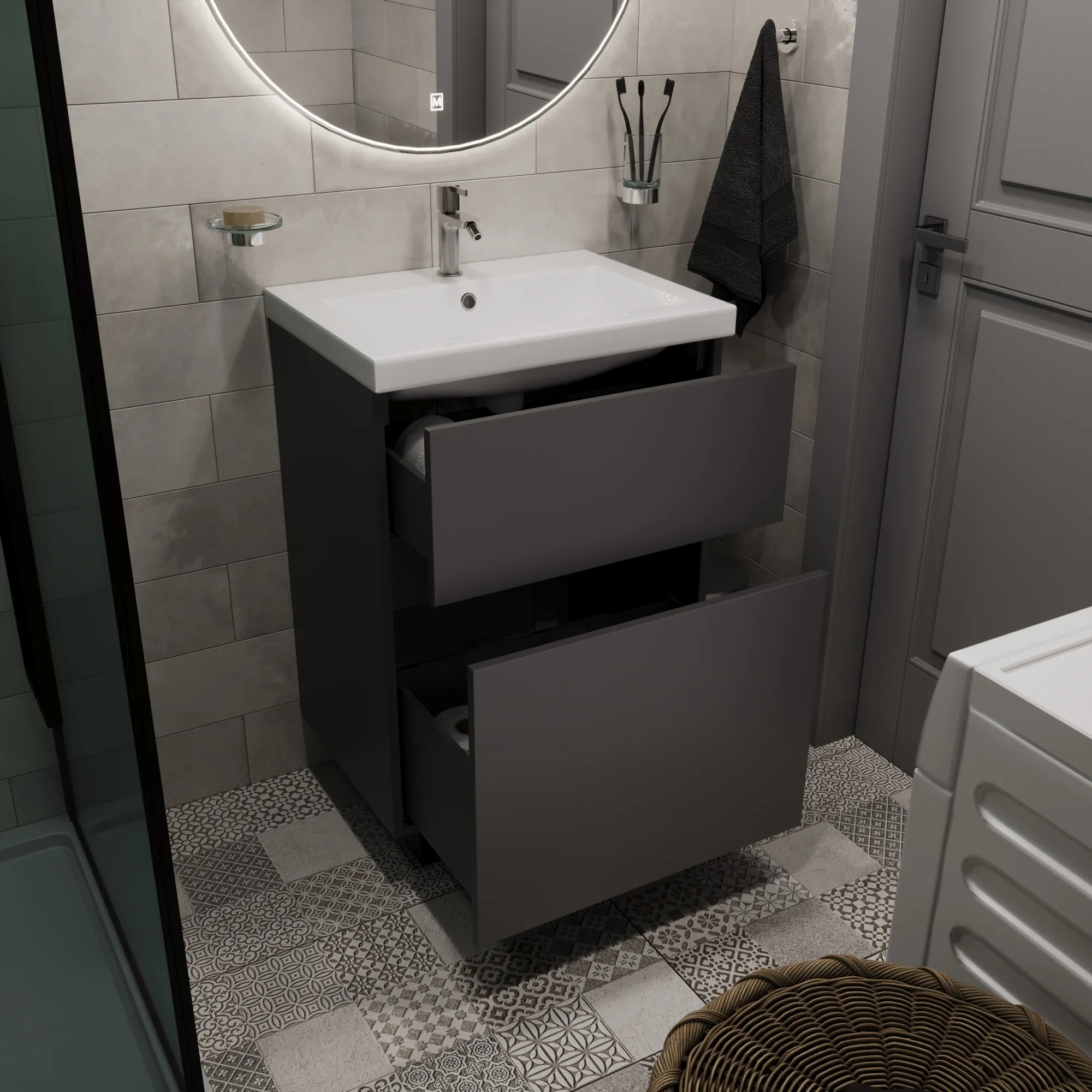 Тумба Aris в трендовом темно-сером цвете – это идеальное сочетание элегантности и функциональности для вашей ванной комнаты. Ее лаконичный и современный дизайн легко впишется в любое интерьерное решение и станет стильным акцентом.