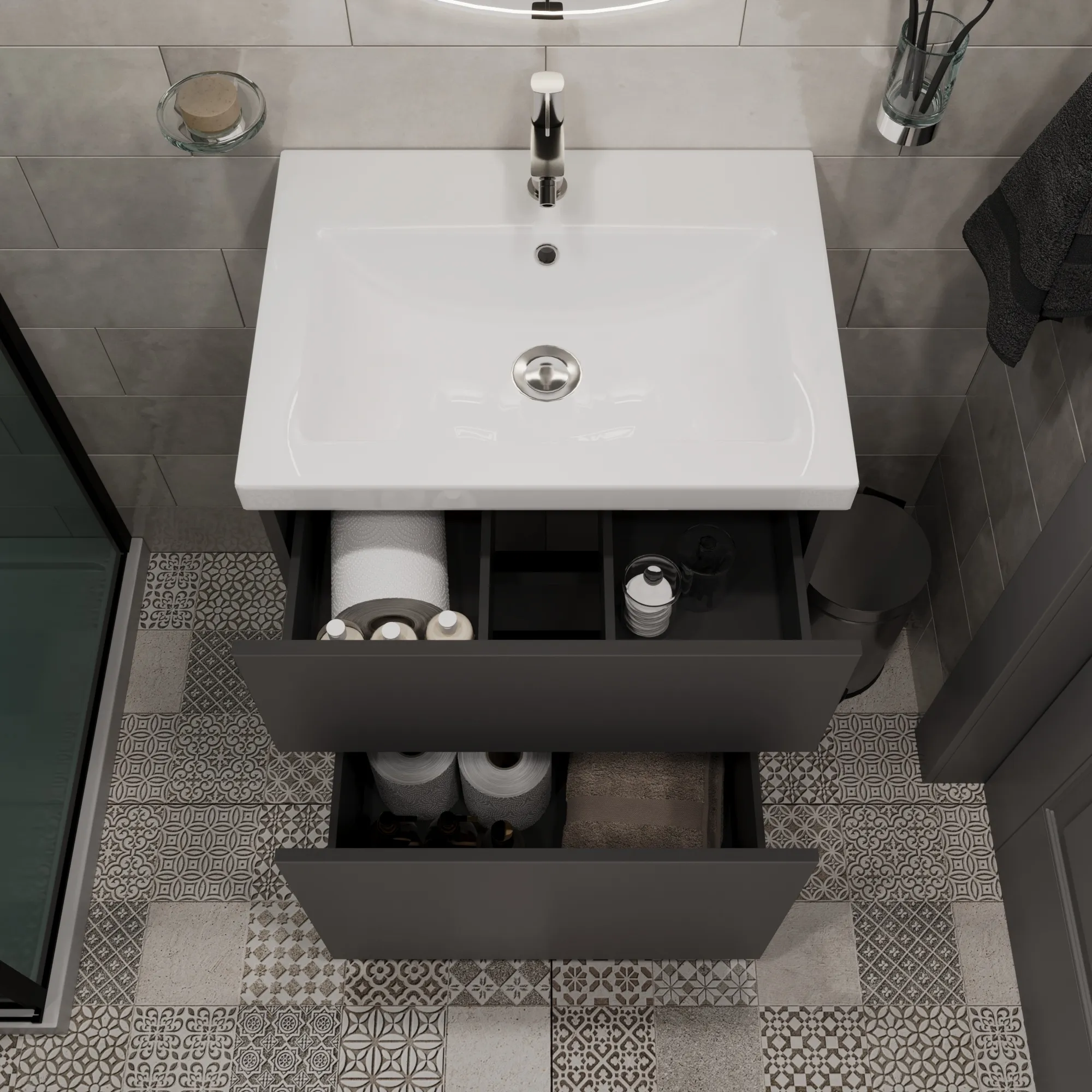 • Выдвижные ящики позволят эффективно организовать хранение различных предметов – средств личной гигиены, косметики, полотенец, бытовой химии, а механизм плавного и бесшумного закрывания добавит удобство в эксплуатации.
