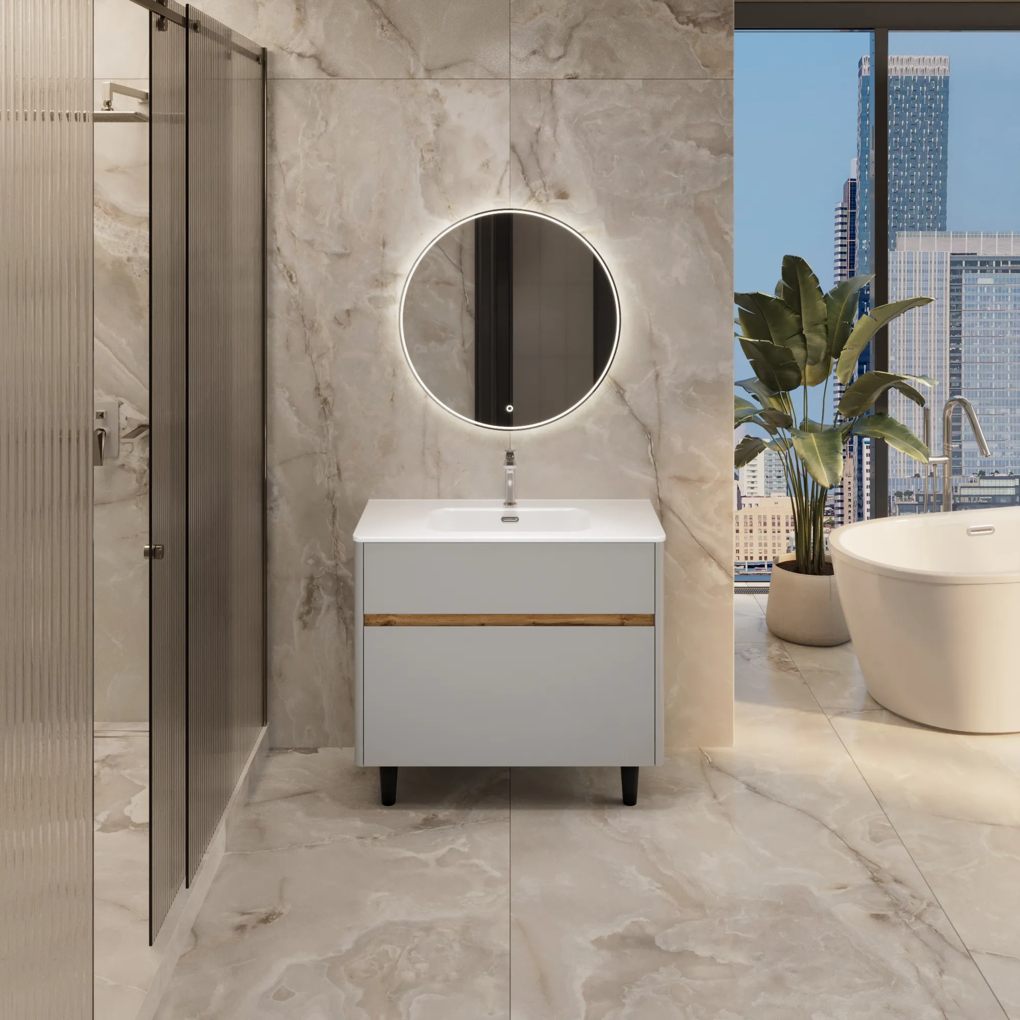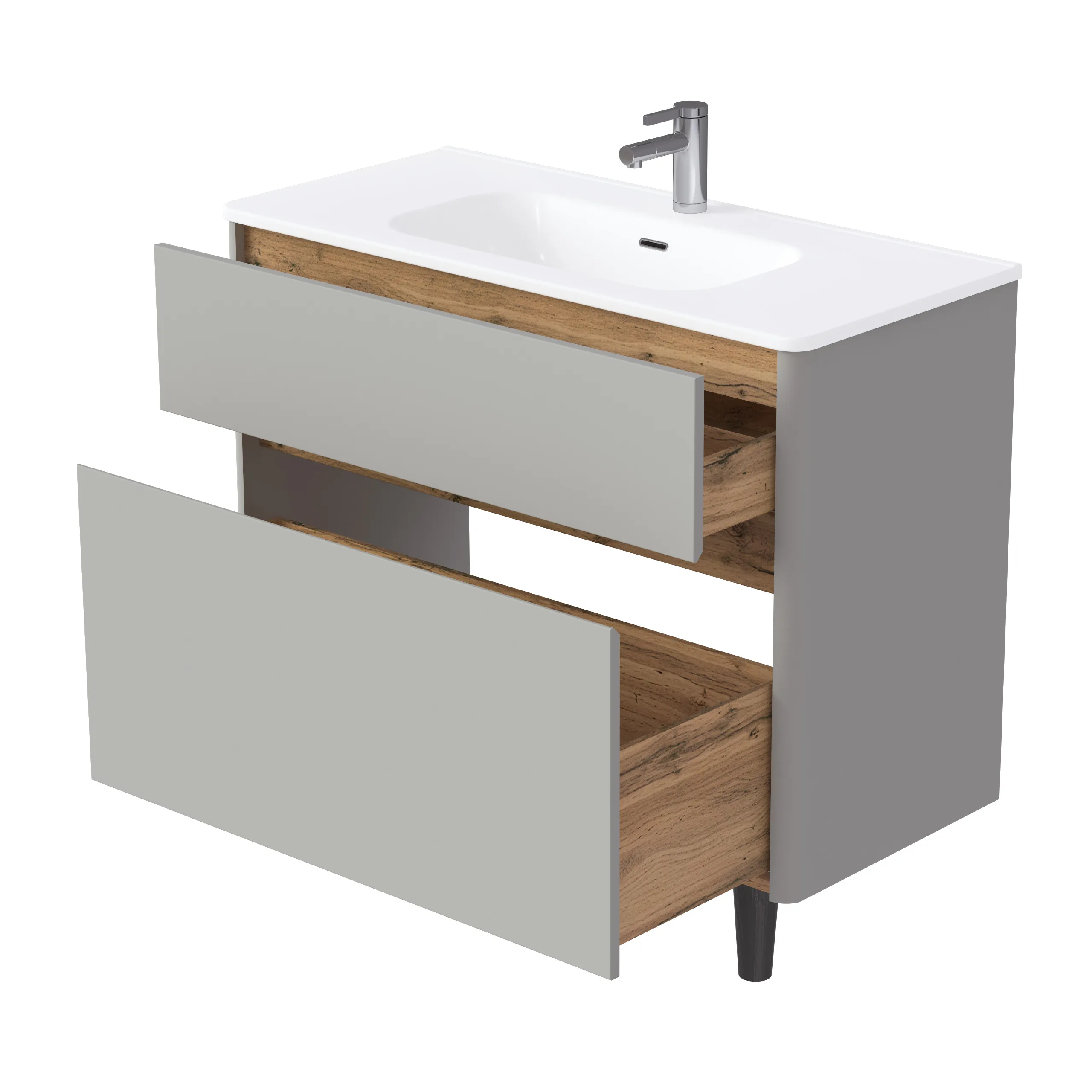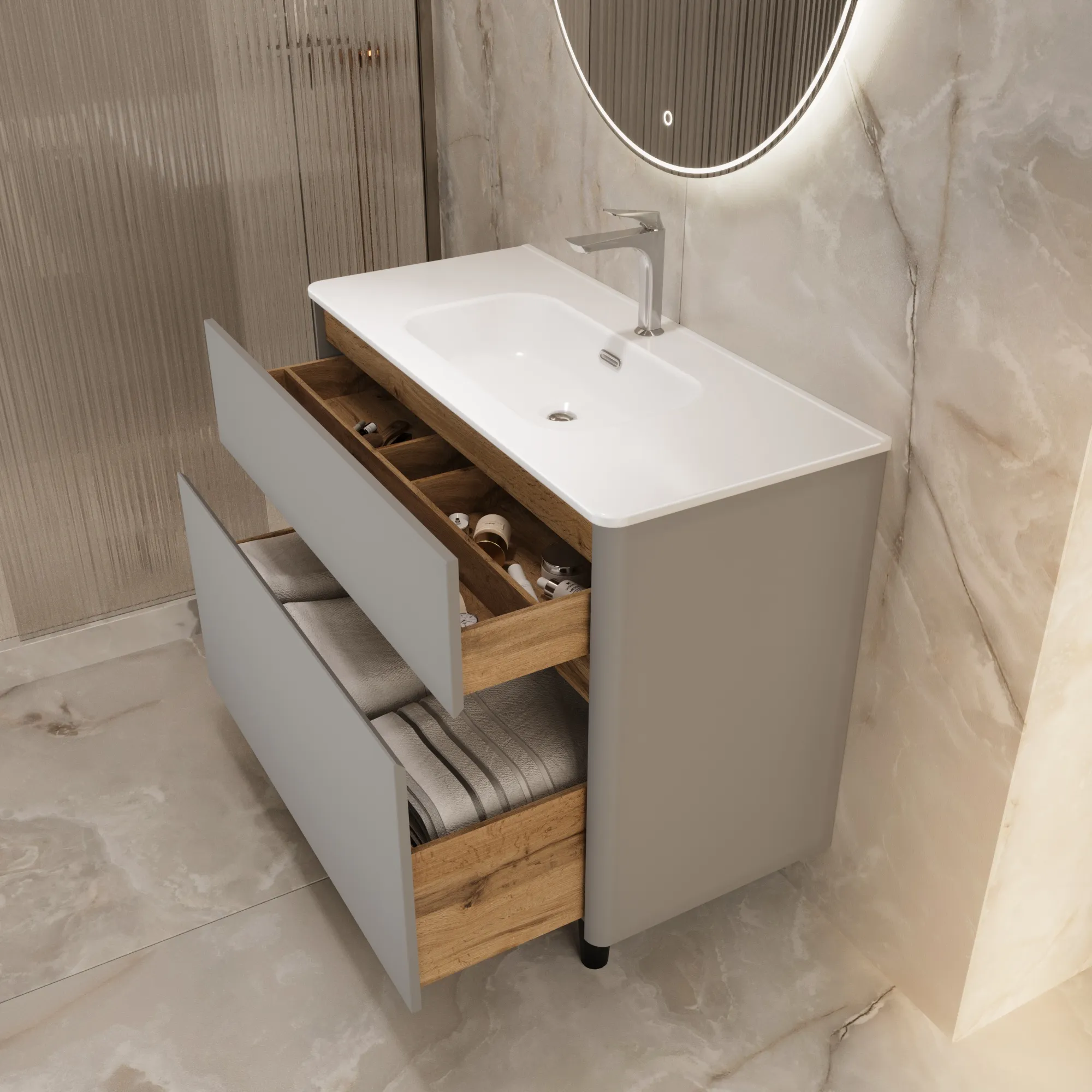Трендовый серый цвет освежает интерьер, делая его современным и мягким, а тумбу подходящей для большинства интерьеров ванной комнаты.