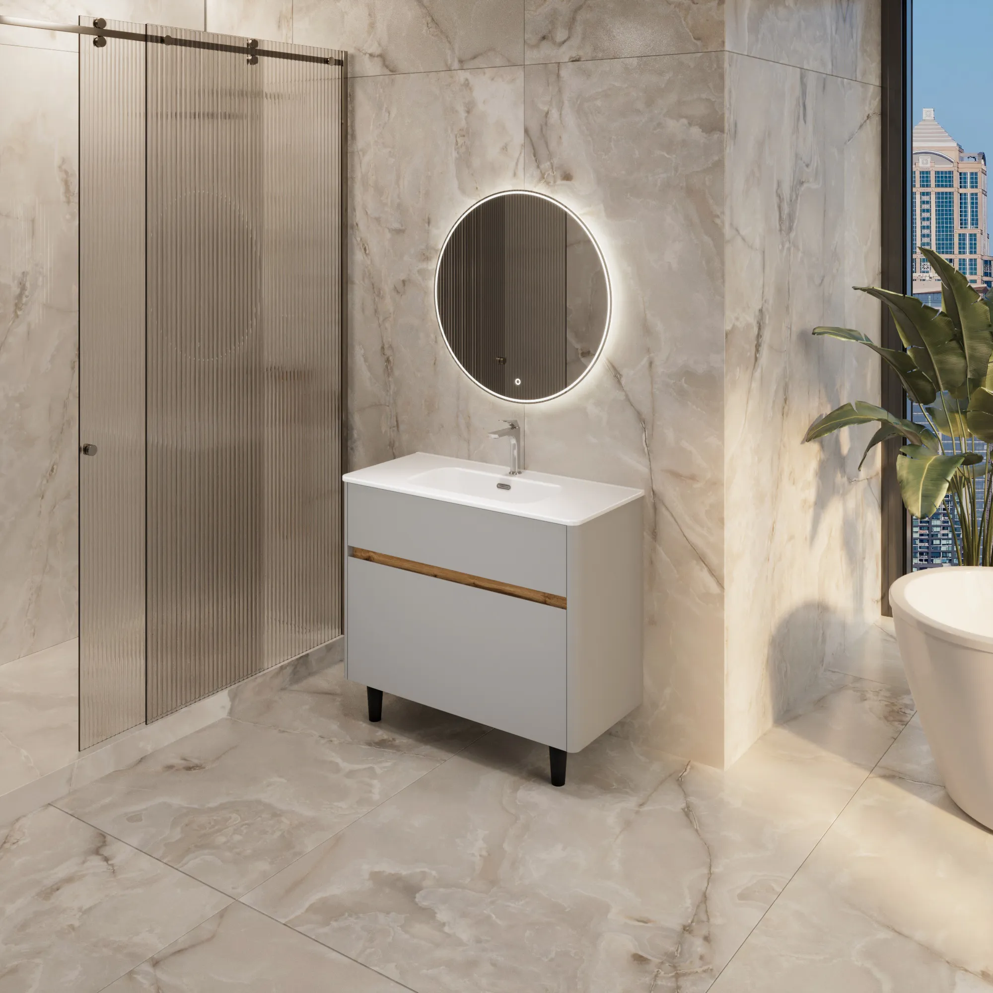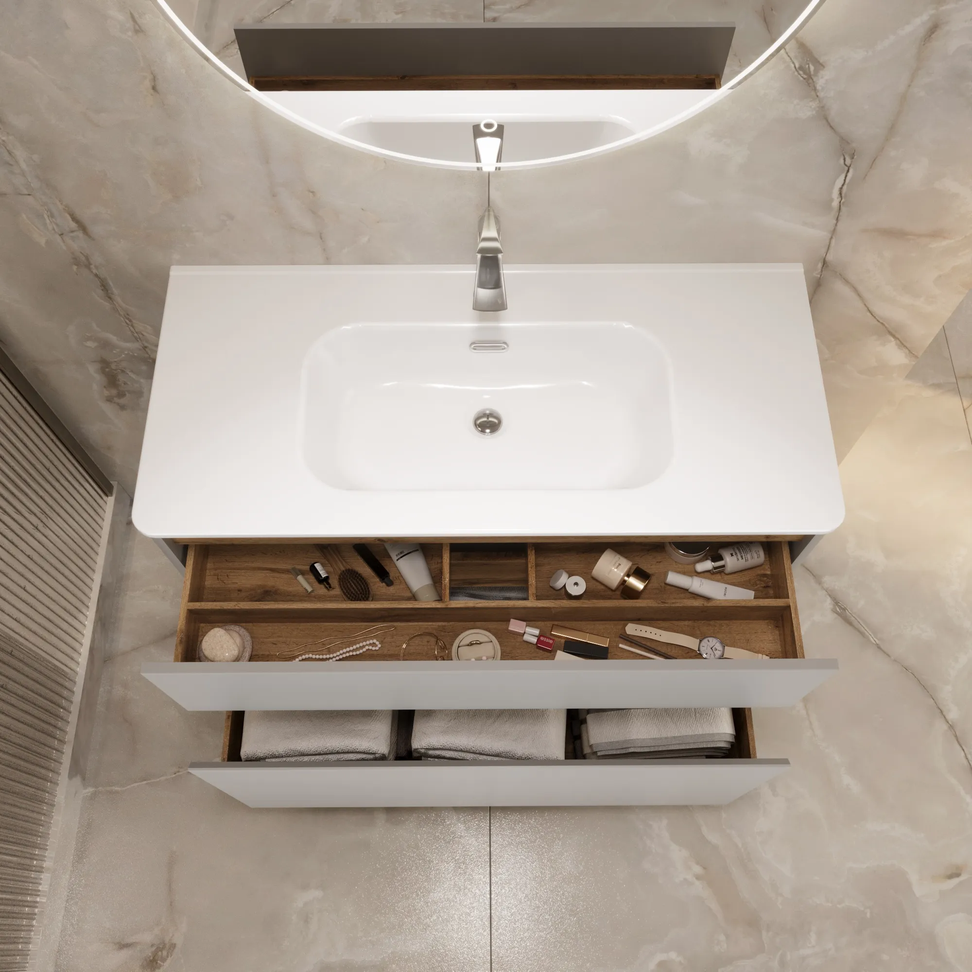 Матовый фасад, интегрированные ручки, керамическая раковина* с широкими бортами для хранения и полки в тон теплому дереву придают интерьеру изящность и подчеркивают уникальный характер.