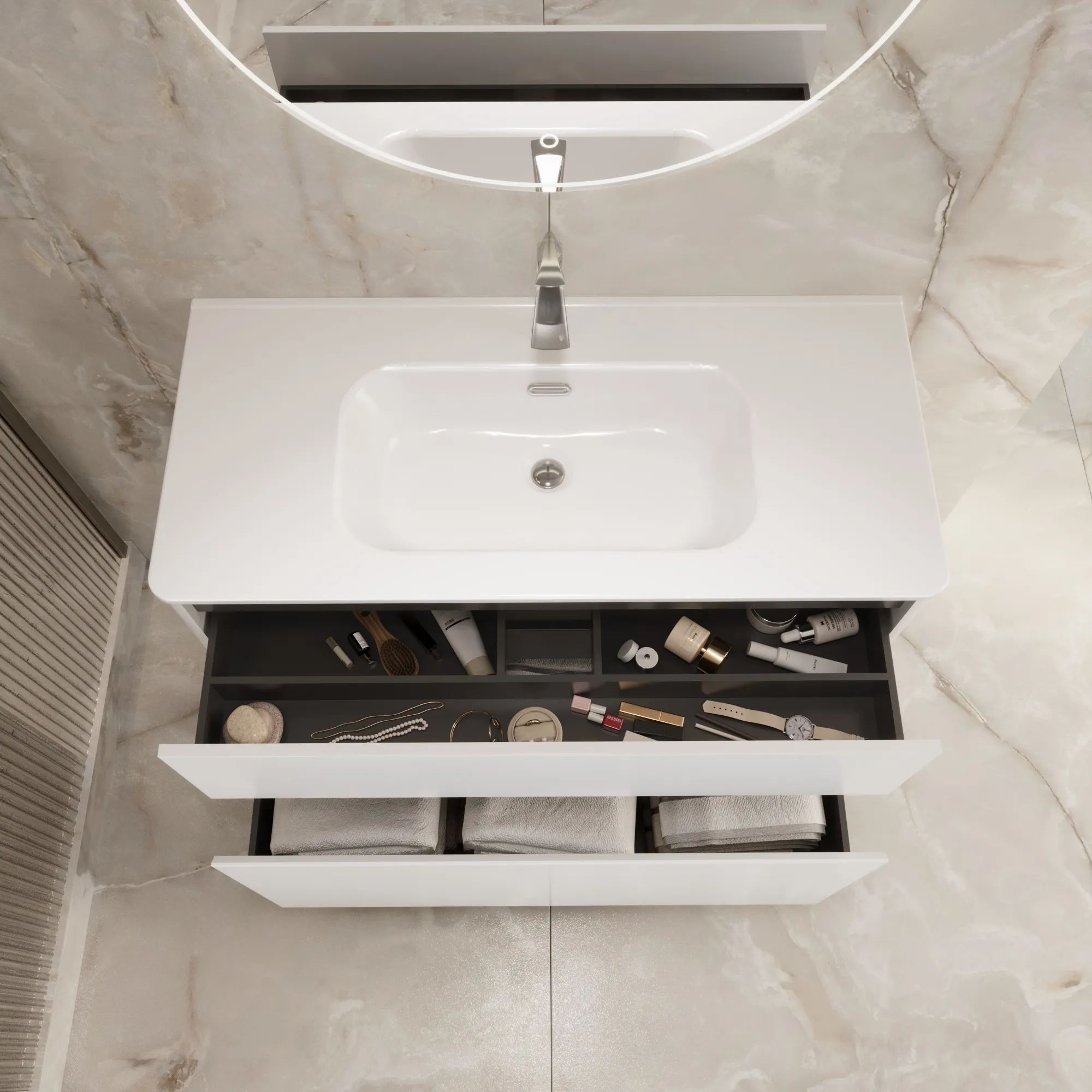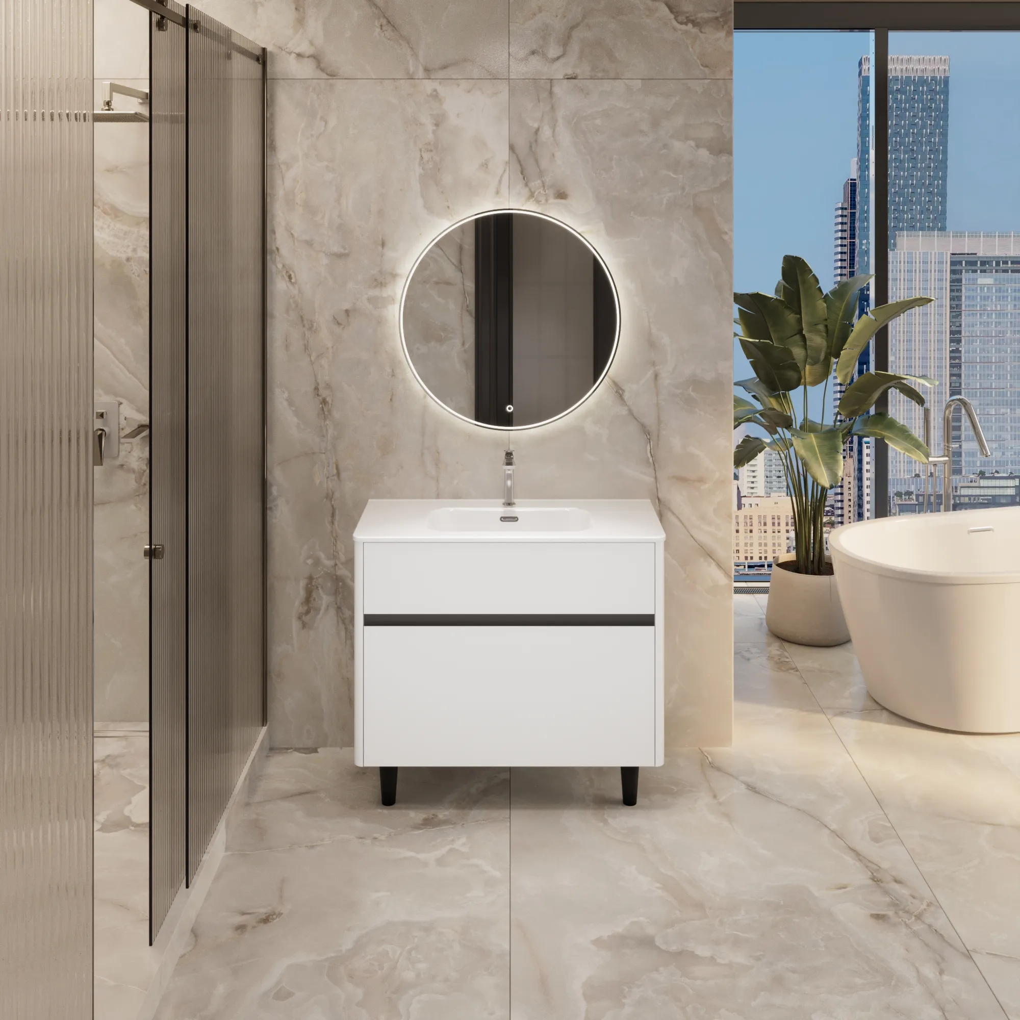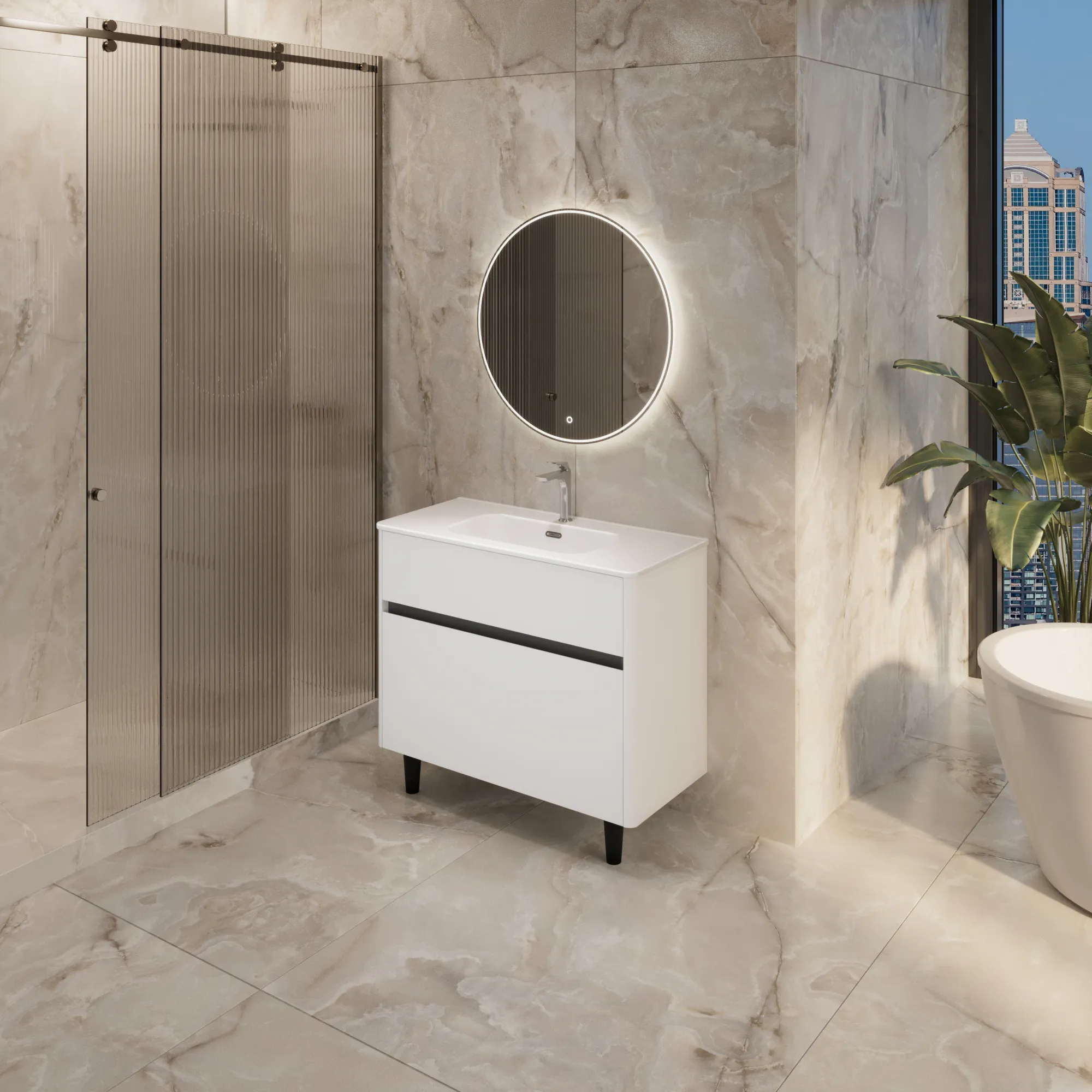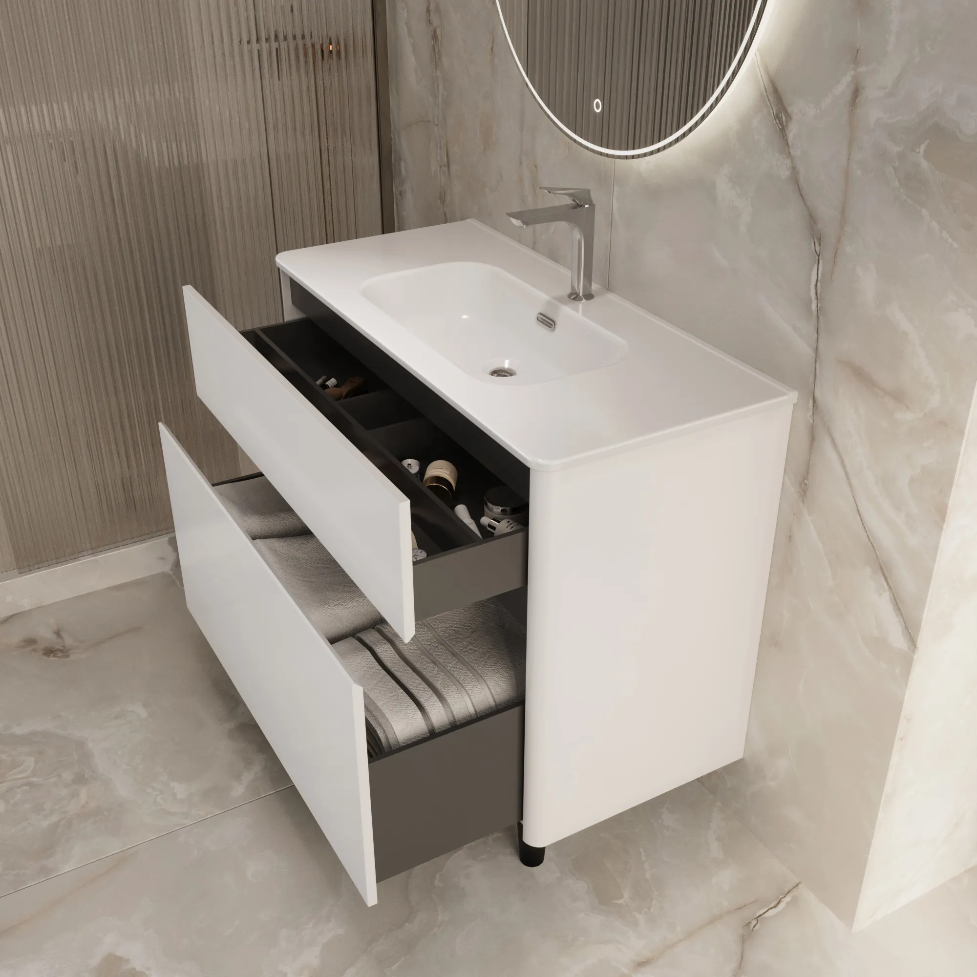 • Материал корпуса и фасада – МДФ, покрытый итальянской матовой эмалью. Благодаря этому тумба сохранит первозданный вид на долгие годы в условиях повышенной влажности.