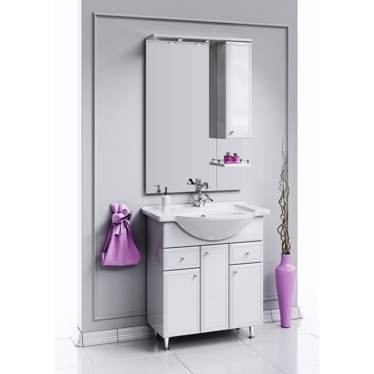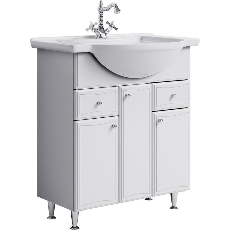 Мебель для ванной Aqwella Барселона-Люкс на ножках с двумя ящиками и корзиной. Материал корпуса: МДФ - Материал фасада: ЛДСП - Стилистика дизайна: современный стиль - Форма мебели: прямоугольная - Система хранения: с ящиком - Фасад из МДФ покрыт пятью слоями матовой эмали, устойчивой к истиранию и не впитывающей загрязнения.