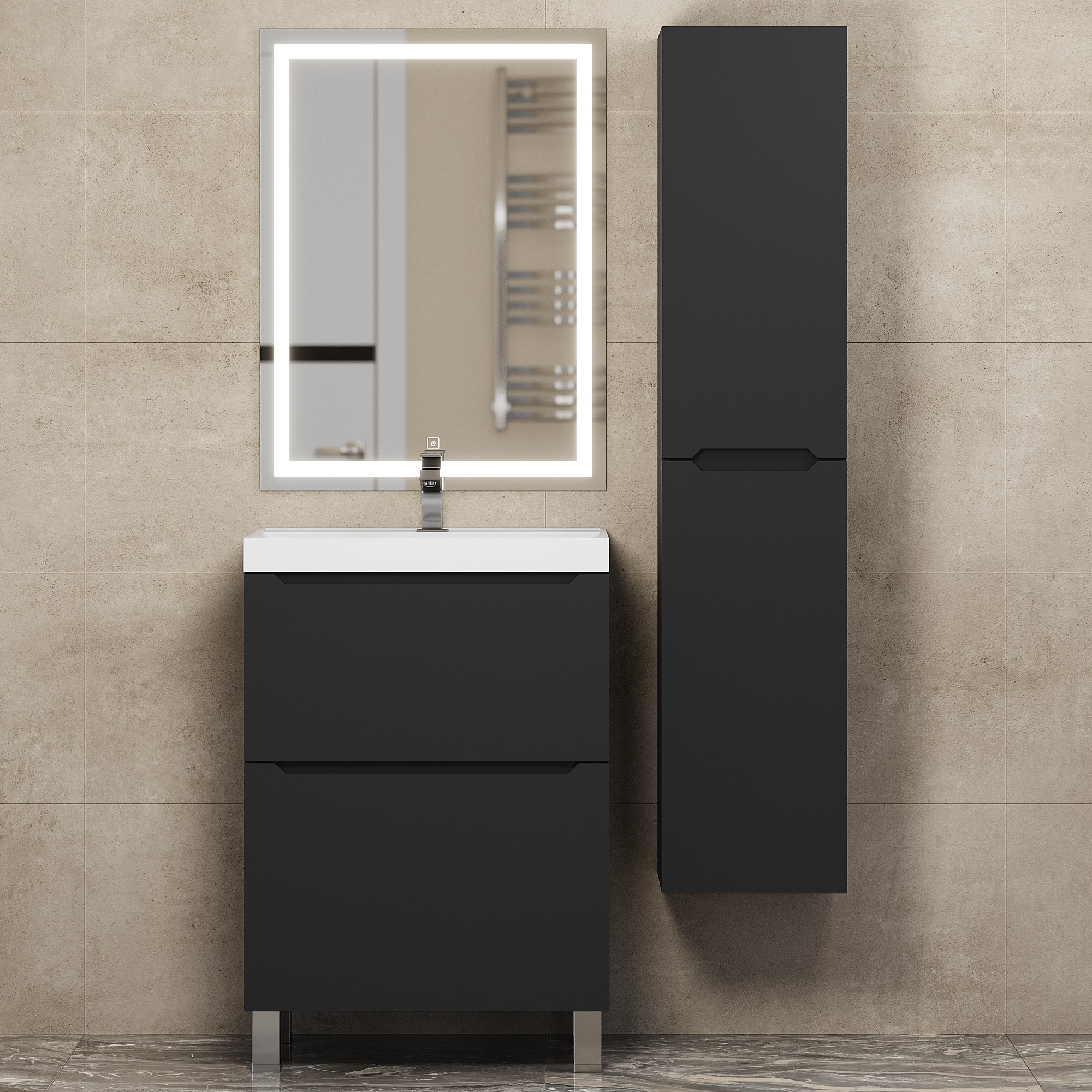 Элегантный минималистичный дизайн тумбы дополняет ее безупречная матовая поверхность.