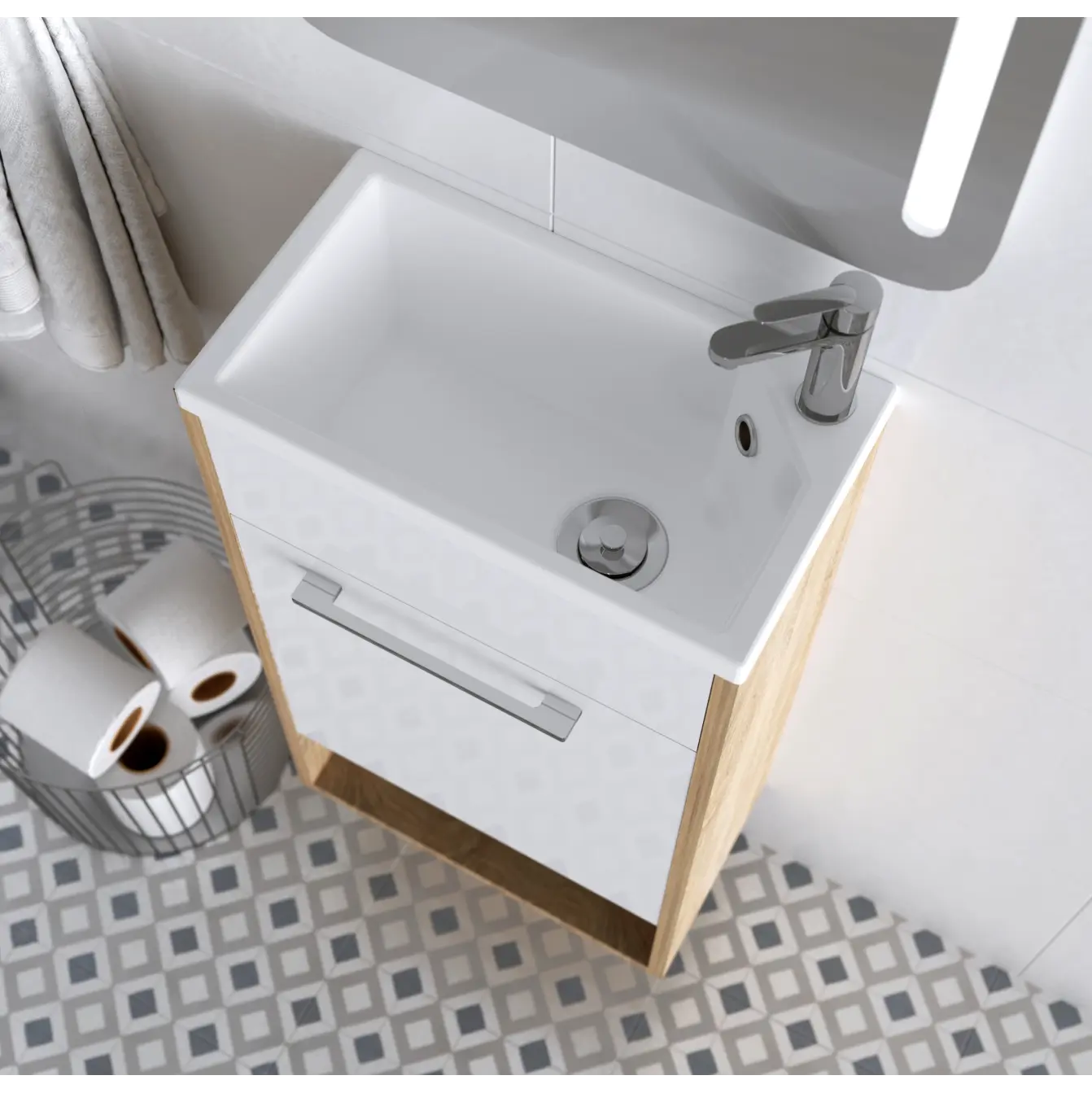 Компактная мебель с уникальными габаритами - глубина тумбы всего 22 см. Мебель выполнена в современном минималистичном стиле, для которого характерны правильные геометрические формы, рациональность и эргономичность. Специально продуманная конструкция без ручек позволяет создать цельный легкий образ, не утяжеленный фурнитурой и дает возможность гармонично вписаться в любой интерьер. Для бережливой повседневной эксплуатации, тумбы оснащены демпферами и дверными петлями с доводчиками, обеспечивающими бесшумное и мягкое закрывание. В комплекте идет раковина из полимерной керамики. Решение идально подойдет в гостевой санузел или маленькую ванную.