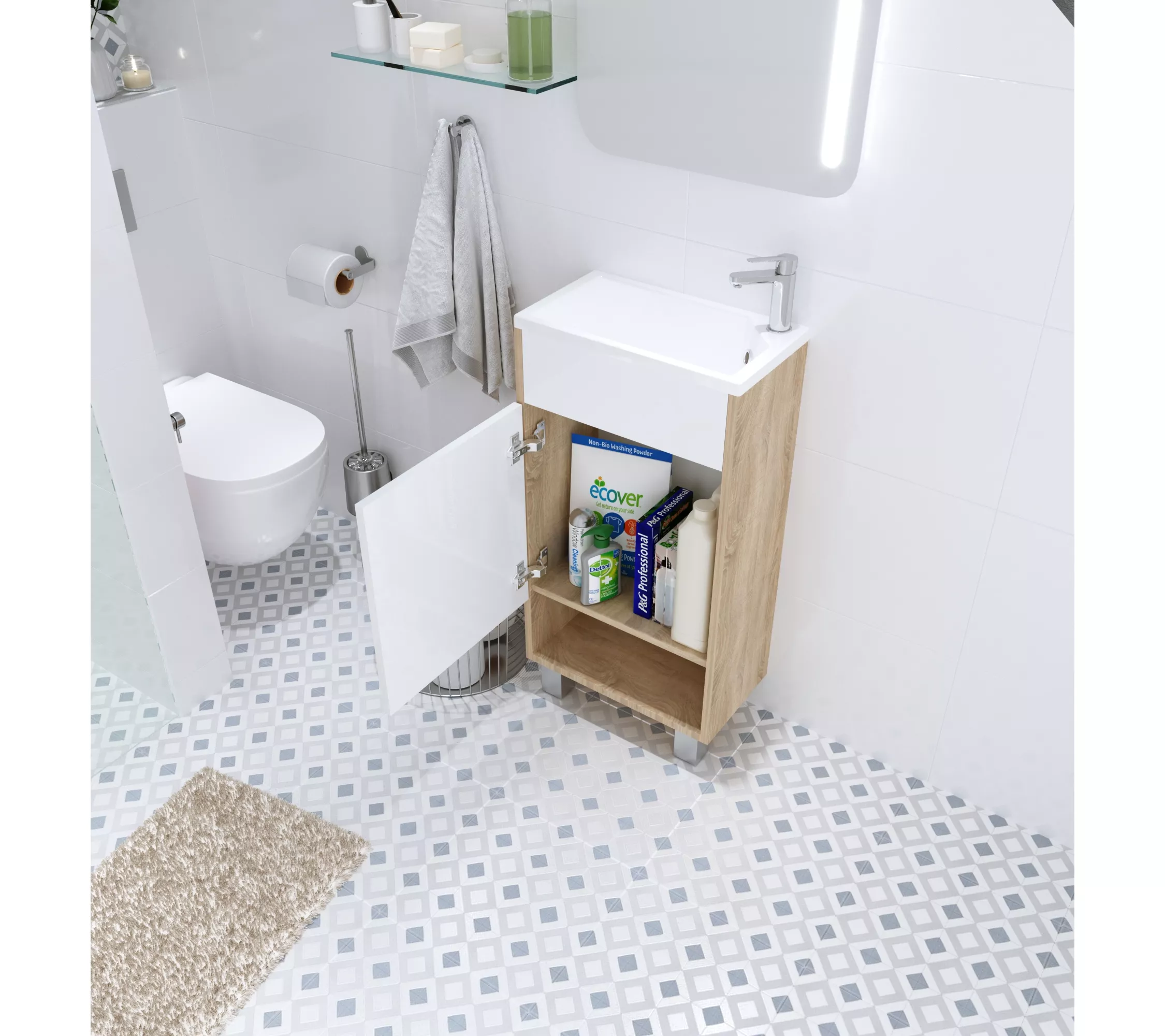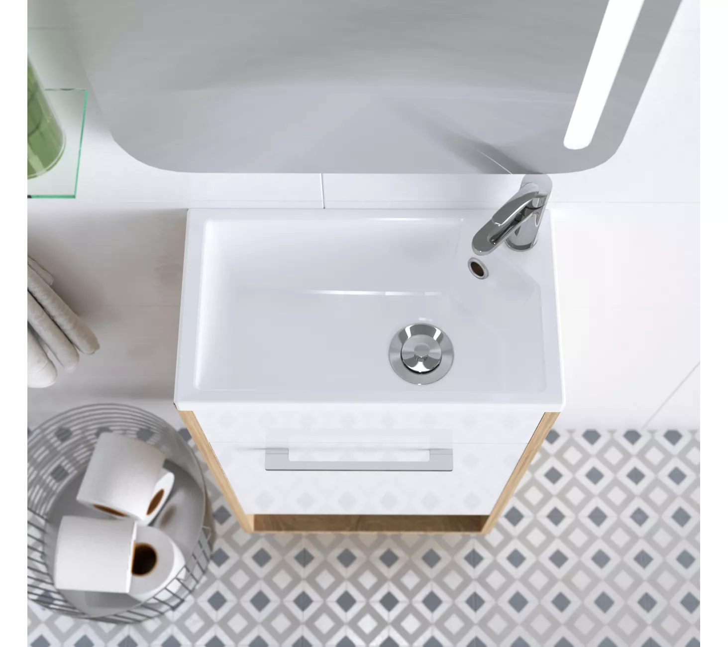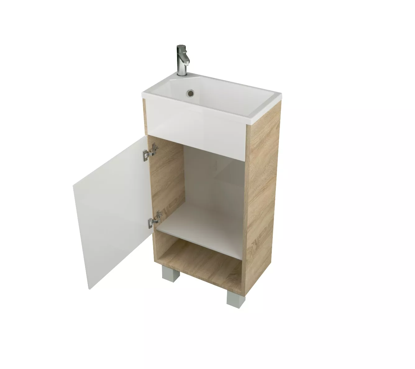 Компактная мебель с уникальными габаритами - глубина тумбы всего 22 см. Мебель выполнена в современном минималистичном стиле, для которого характерны правильные геометрические формы, рациональность и эргономичность. Специально продуманная конструкция без ручек позволяет создать цельный легкий образ, не утяжеленный фурнитурой и дает возможность гармонично вписаться в любой интерьер. Для бережливой повседневной эксплуатации, тумбы оснащены демпферами и дверными петлями с доводчиками, обеспечивающими бесшумное и мягкое закрывание. В комплекте идет раковина из полимерной керамики. Решение идально подойдет в гостевой санузел или маленькую ванную.
