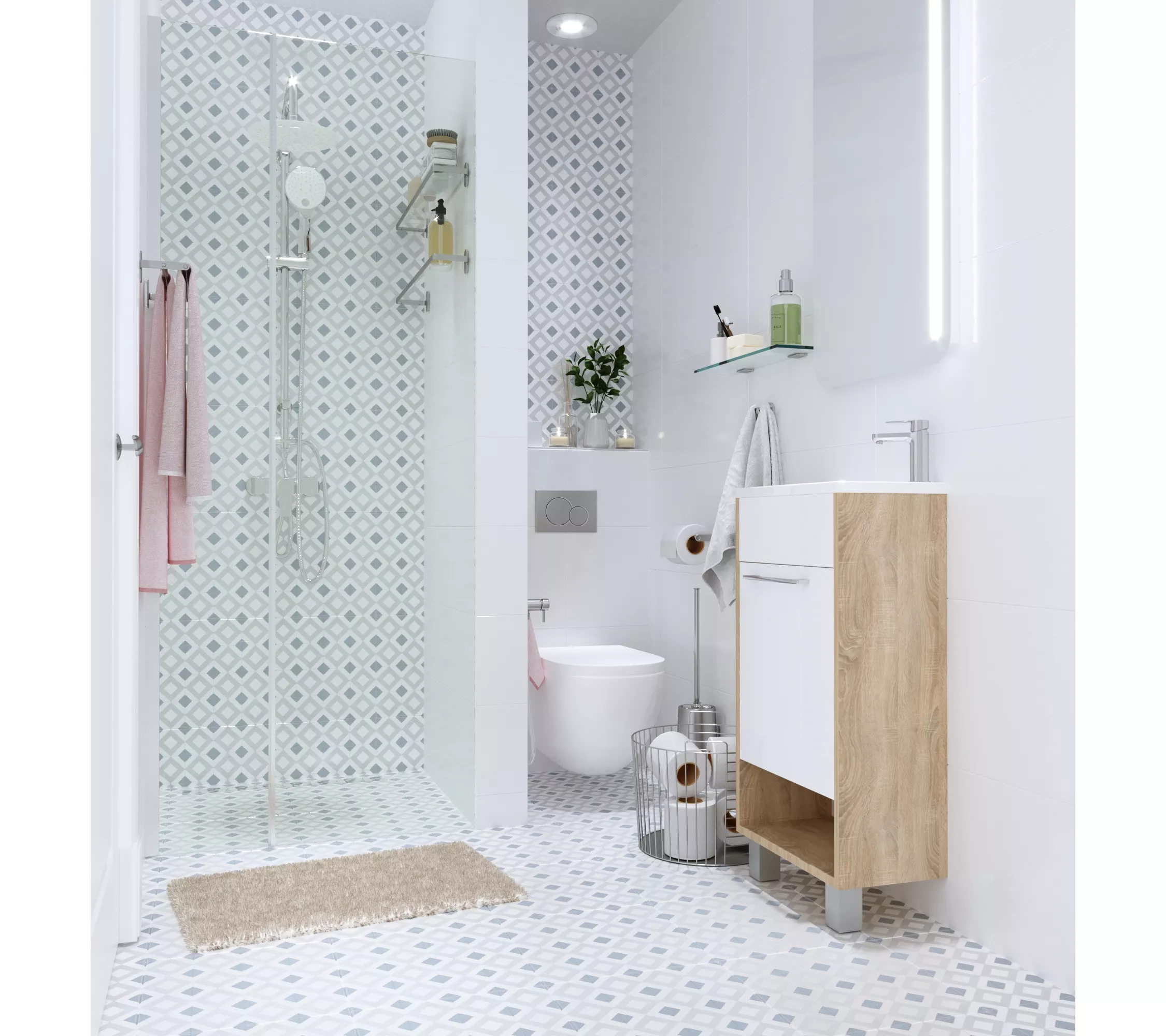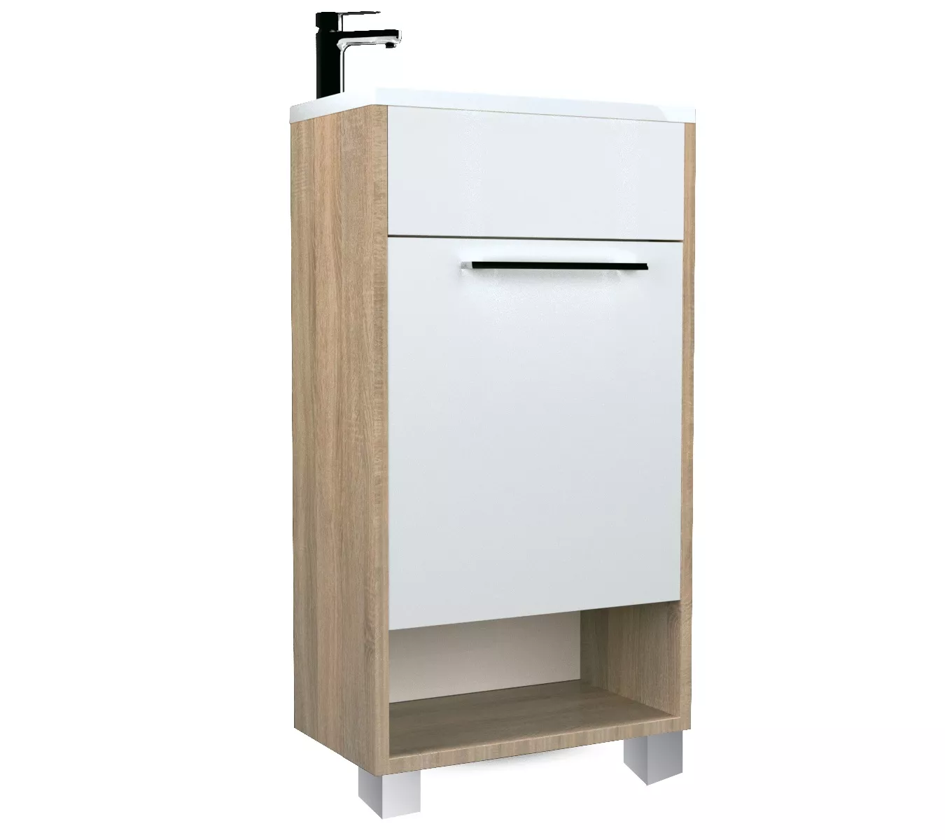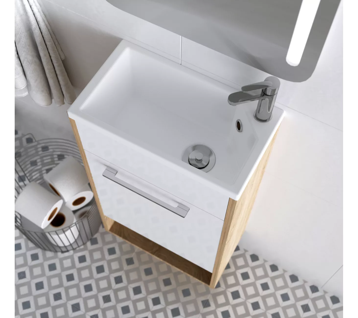 Компактная мебель с уникальными габаритами - глубина тумбы всего 22 см. Мебель выполнена в современном минималистичном стиле, для которого характерны правильные геометрические формы, рациональность и эргономичность. Специально продуманная конструкция без ручек позволяет создать цельный легкий образ, не утяжеленный фурнитурой и дает возможность гармонично вписаться в любой интерьер. Для бережливой повседневной эксплуатации, тумбы оснащены демпферами и дверными петлями с доводчиками, обеспечивающими бесшумное и мягкое закрывание. В комплекте идет раковина из полимерной керамики. Решение идально подойдет в гостевой санузел или маленькую ванную.