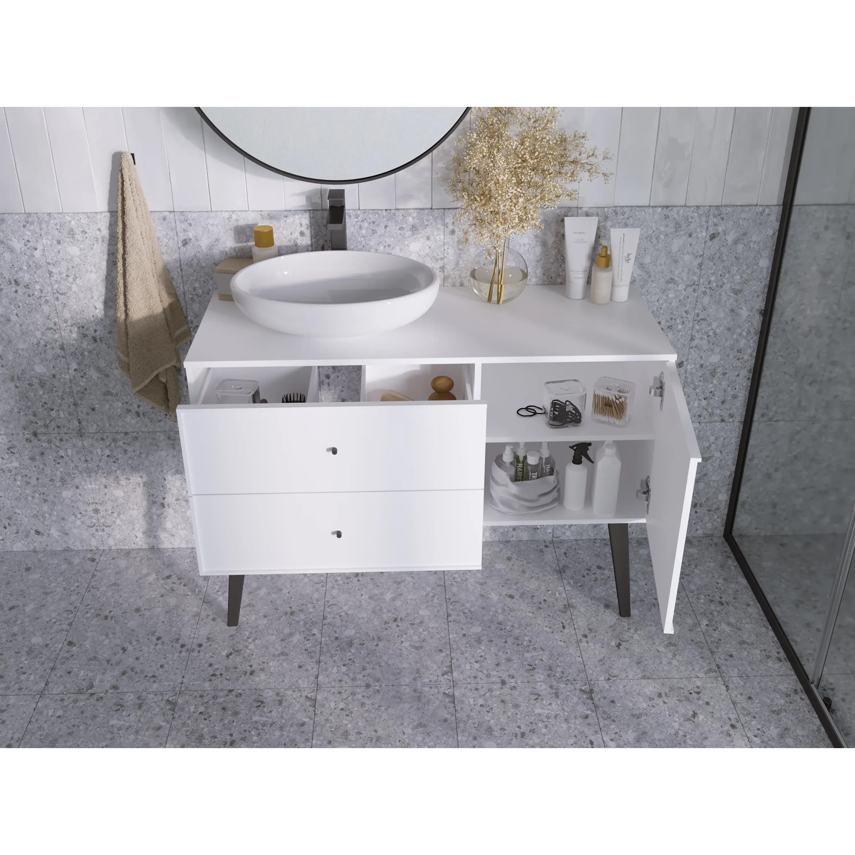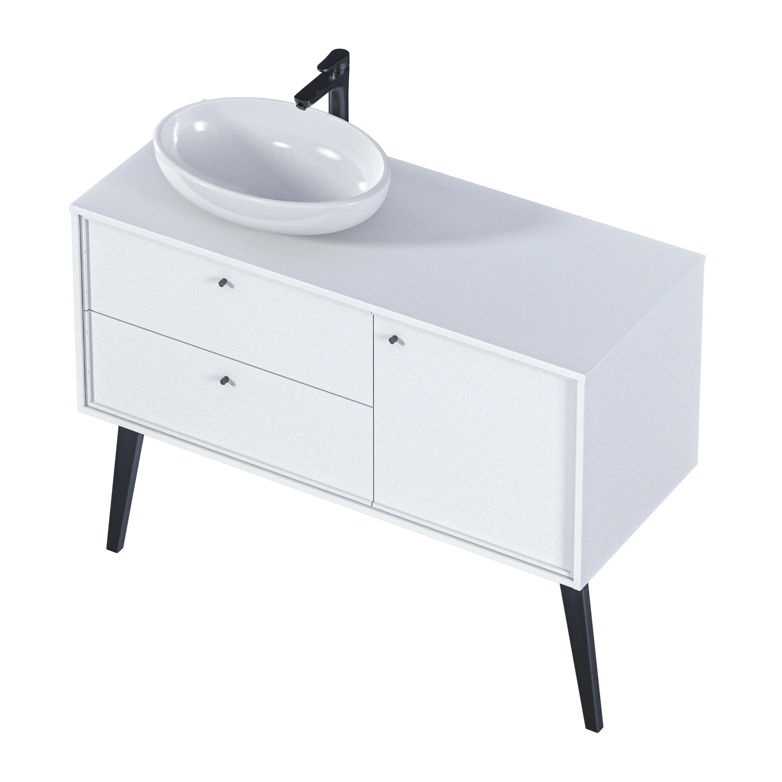 Модель разработана специально под накладную раковину, что позволяет создать современный гармоничный образ ванной комнаты. Внутреннее пространство тумбы оптимально организовано для хранения различных принадлежностей. Каждый ящик снабжен стильными черными ручками, которые эффектно контрастируют с белым фоном и создают интересный визуальный акцент.