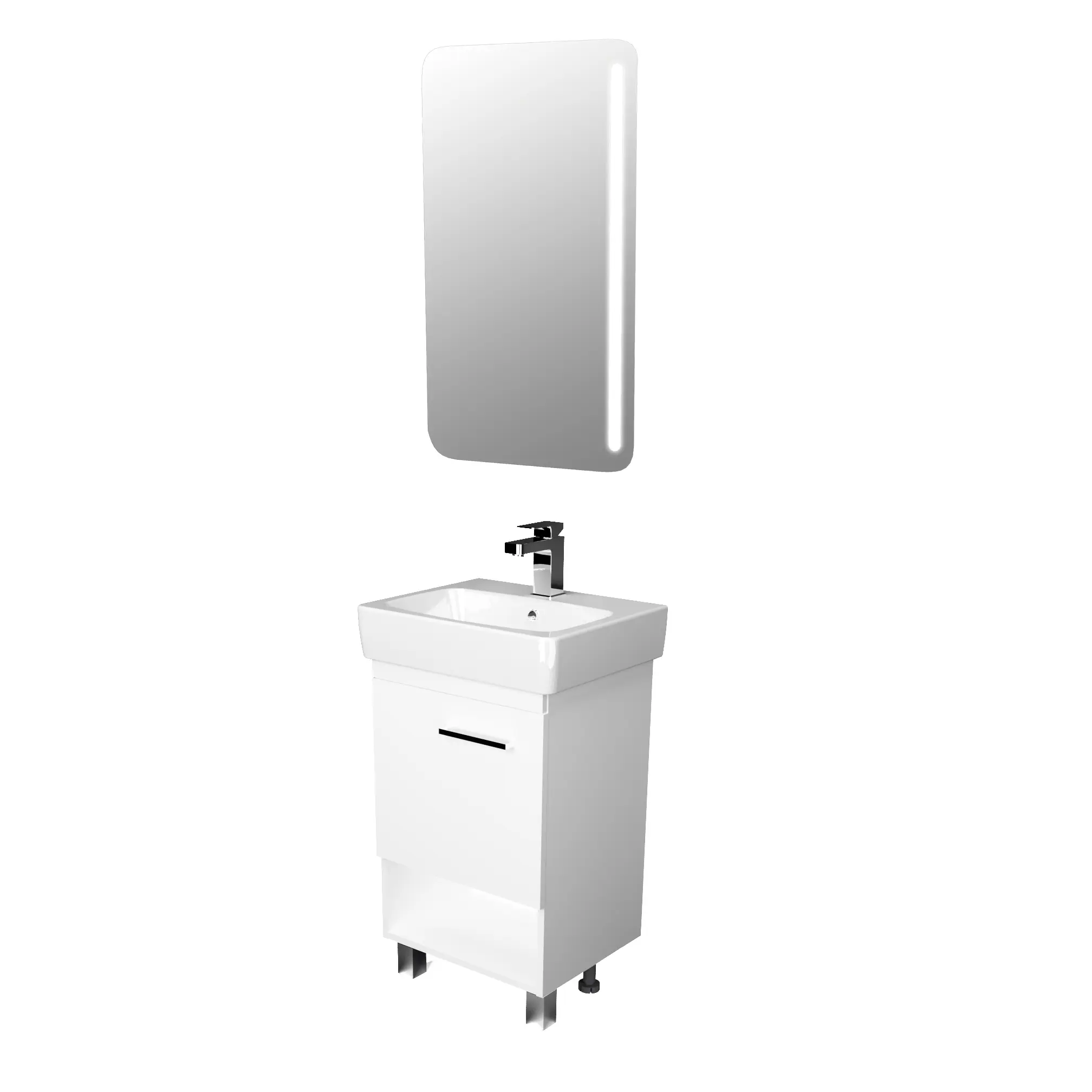 Компактная мебель выполнена в современном минималистичном стиле, для которого характерны правильные геометрические формы, рациональность и эргономичность. Для бережливой повседневной эксплуатации, тумбы оснащены демпферами и дверными петлями с доводчиками, обеспечивающими бесшумное и мягкое закрывание.