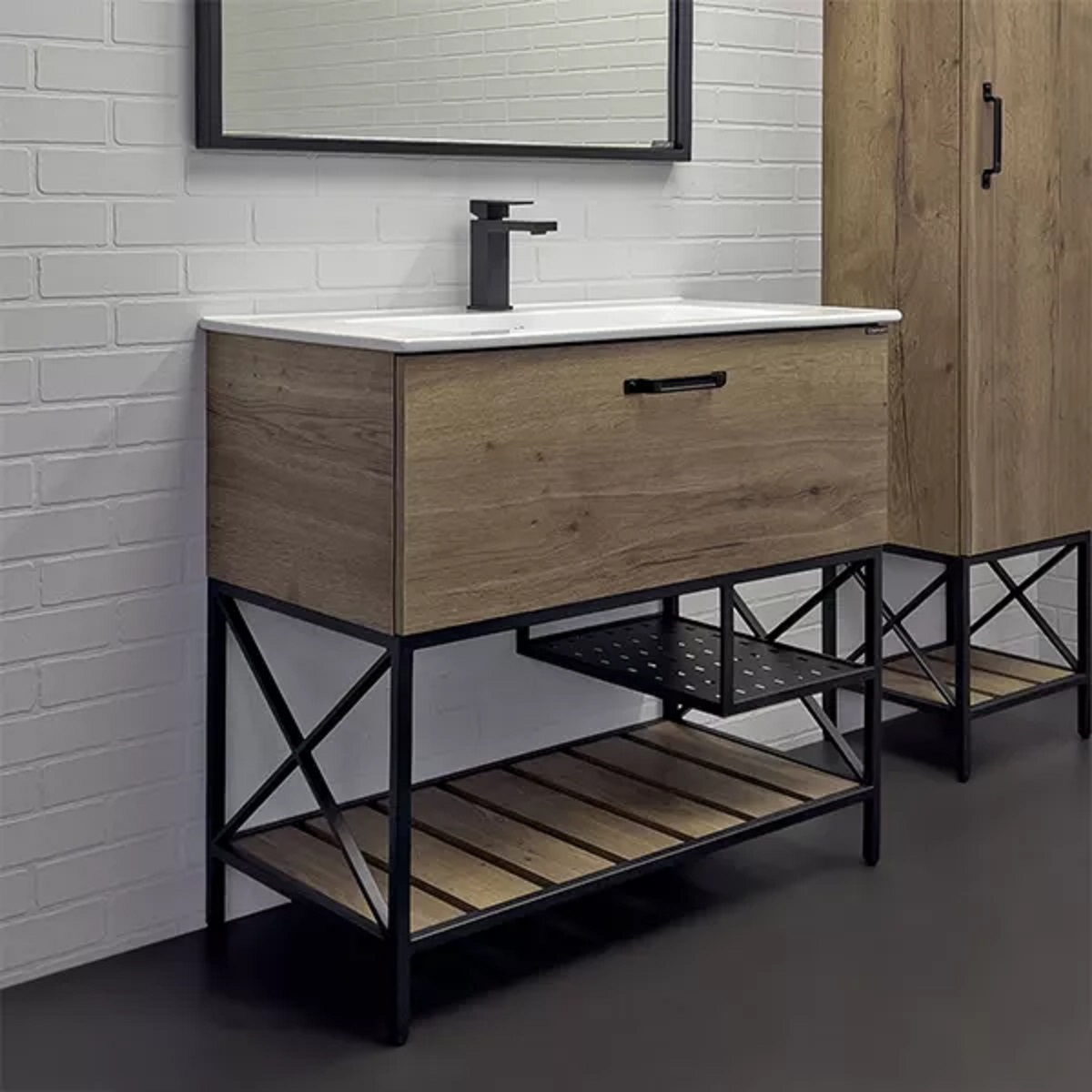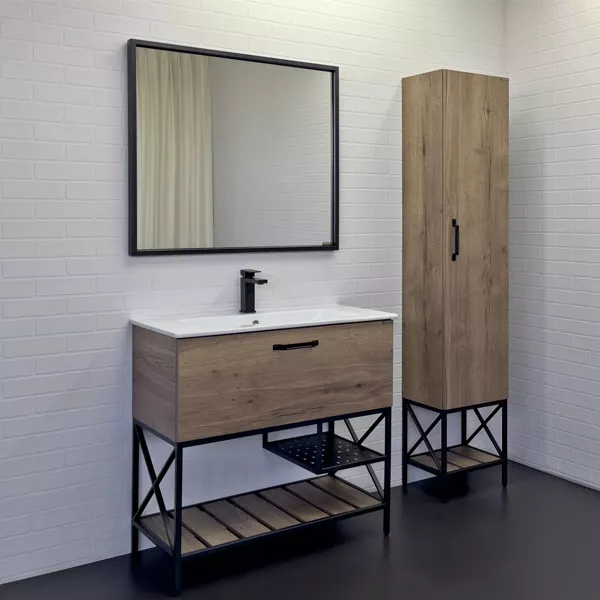Название: Тумба-умывальник Габариты (ШхВхГ): 910*870*465 мм Варианты цвета корпуса и фасада: Дуб темный Материал корпуса: влагостойкое ЛДСП Варианты цвета каркаса: черный муар Материал каркаса: сталь Комплектация: накладная раковина Comforty 90E Напольная тумба с одним большим выкатным ящиком оборудованным системой плавного закрывания. Фасад и корпус тумбы изготовлены из влагостойкого ДСП, созданного по уникальной технологии «Синхронное тиснение» в декоре «дуб темный». Этот декор при прикосновении дарит ощущение натуральной древесины. В комплекте керамическая раковина с прямоугольной чашей. В основе тумбы - каркас из стального профиля окрашенный черной эмалью с нижней широкой полкой и средней полкой для полотенец. Стильная ручка ящика в том же цвете что и каркас. Тумба подготовлена для подключения водоснабжения снизу. Техническая информация по мебели для ванных комнат Comforty Схема монтажа и подключения коммуникаций