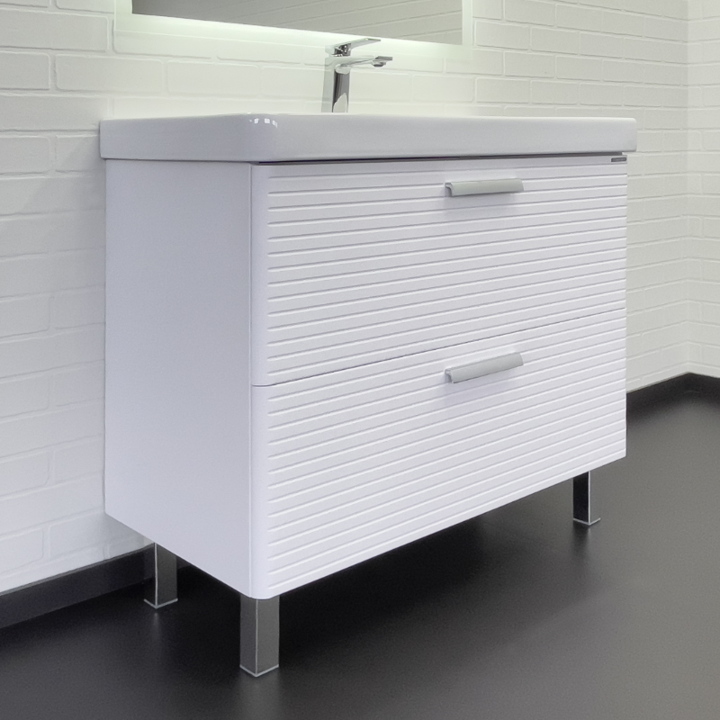 Комплектация: керамическая раковина Comforty 4490 Напольная тумба с двумя выдвижными ящиками оснащенными направляющими с системой плавного закрывания. Оригинальные эргономичные ручки цвета хром. Фасады тумбы изготовлены из МДФ, фрезерованы горизонтальным узором и облицованы белой матовой пленкой. Тумба подготовлена для подключения водоснабжения снизу и сзади.