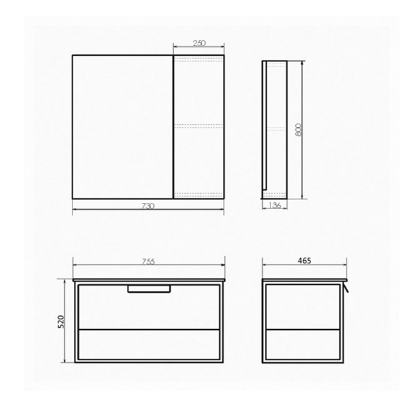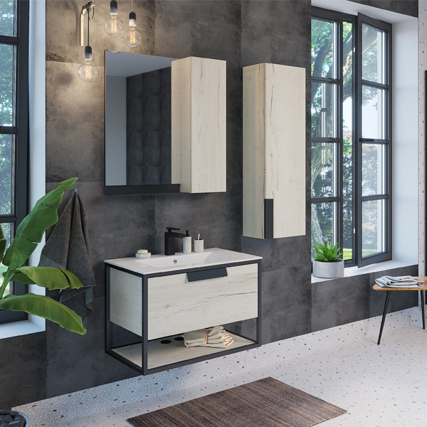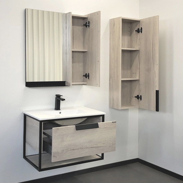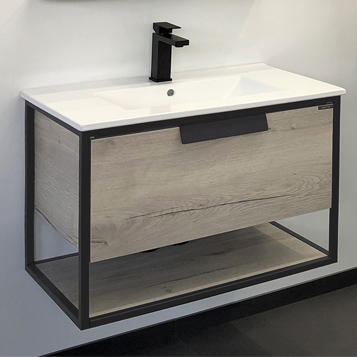 Подвесная тумба-умывальник с одним выкатным ящиком, оснащенным системой плавного закрывания и нижней полкой открытого хранения. В основе тумбы - каркас из стального профиля окрашенный черной матовой эмалью.