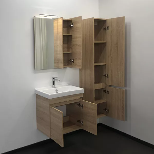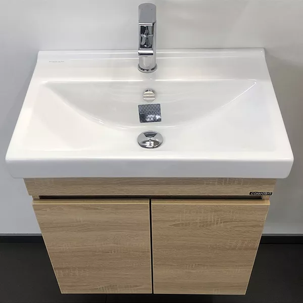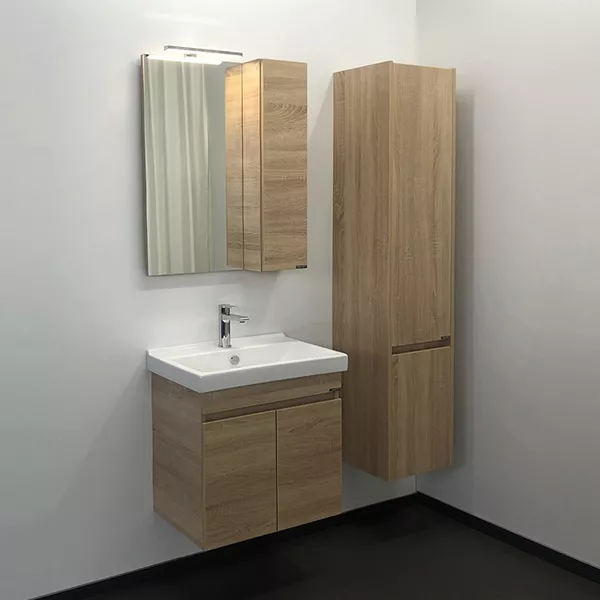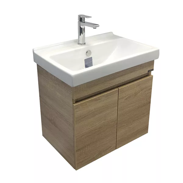 - Подвесная тумба-умывальник шириной 60 см в современном стиле с двумя распашными дверцами для хранения принадлежностей для умывания и бытовой химии. Петли створок оснащены механизмами плавного закрывания. Фасады и корпус из влагостойкого ЛДСП цвета дуб сонома.Габариты (ШхВхГ): 600*630*400 мм
