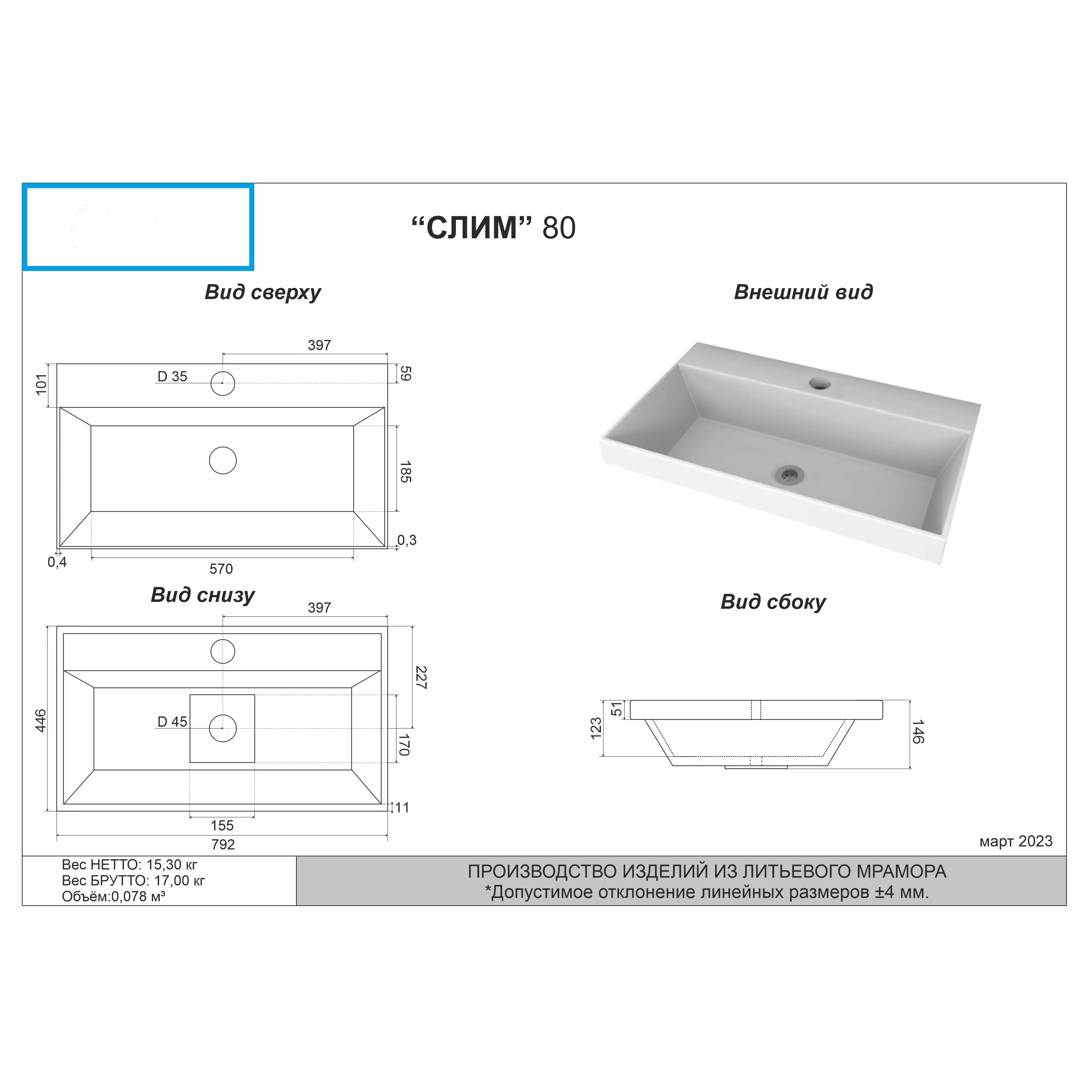 2.Раковина Океан 60 из литьевого мрамора