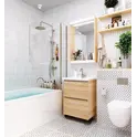 Мебель выполнена в современном минималистичном стиле, для которого характерны правильные геометрические формы, рациональность и эргономичность. Специально продуманная конструкция без ручек позволяет создать цельный легкий образ, не утяжеленный фурнитурой и дает возможность гармонично вписаться в любой интерьер. Для бережливой повседневной эксплуатации, тумбы оснащены демпферами обеспечивающими бесшумное и мягкое закрывание.