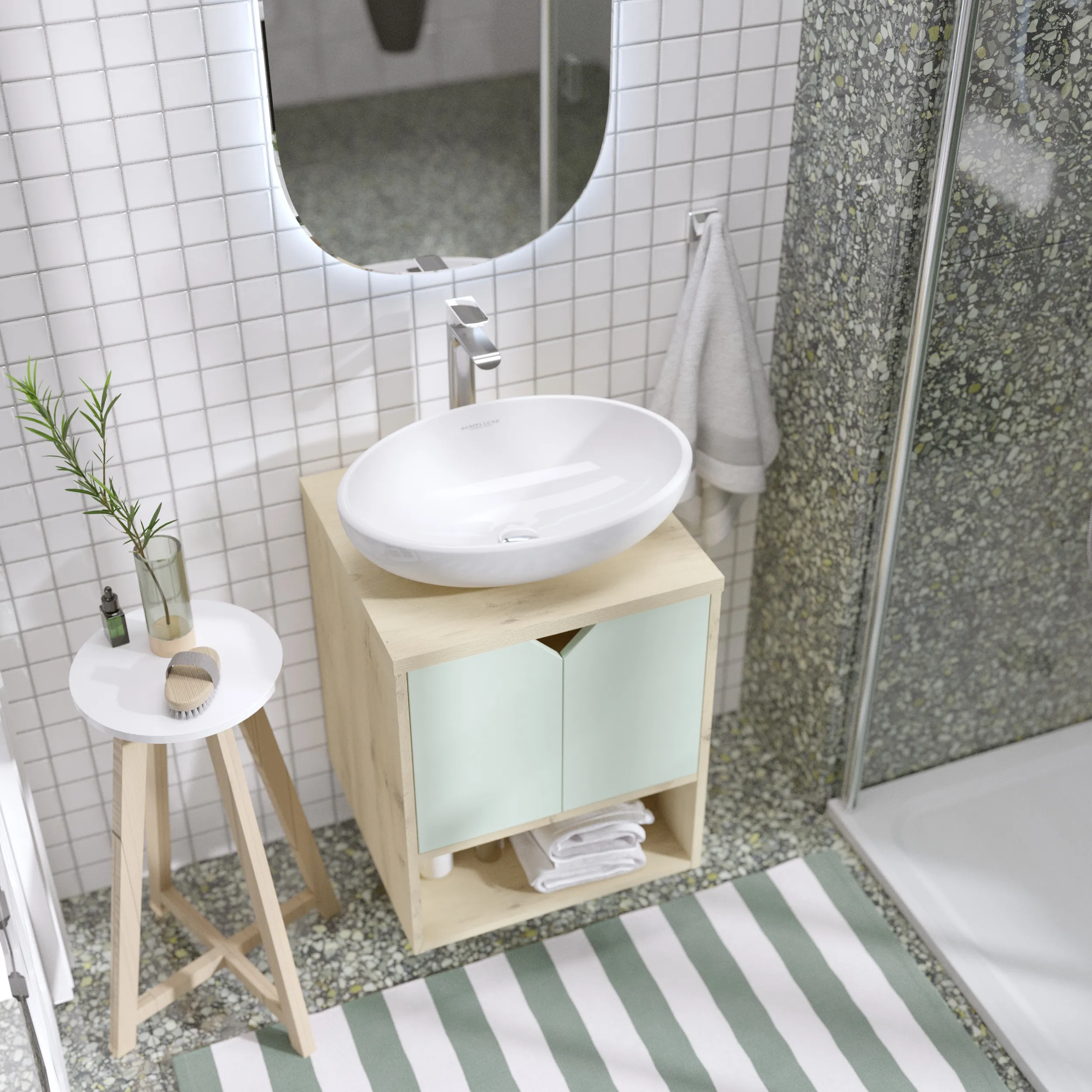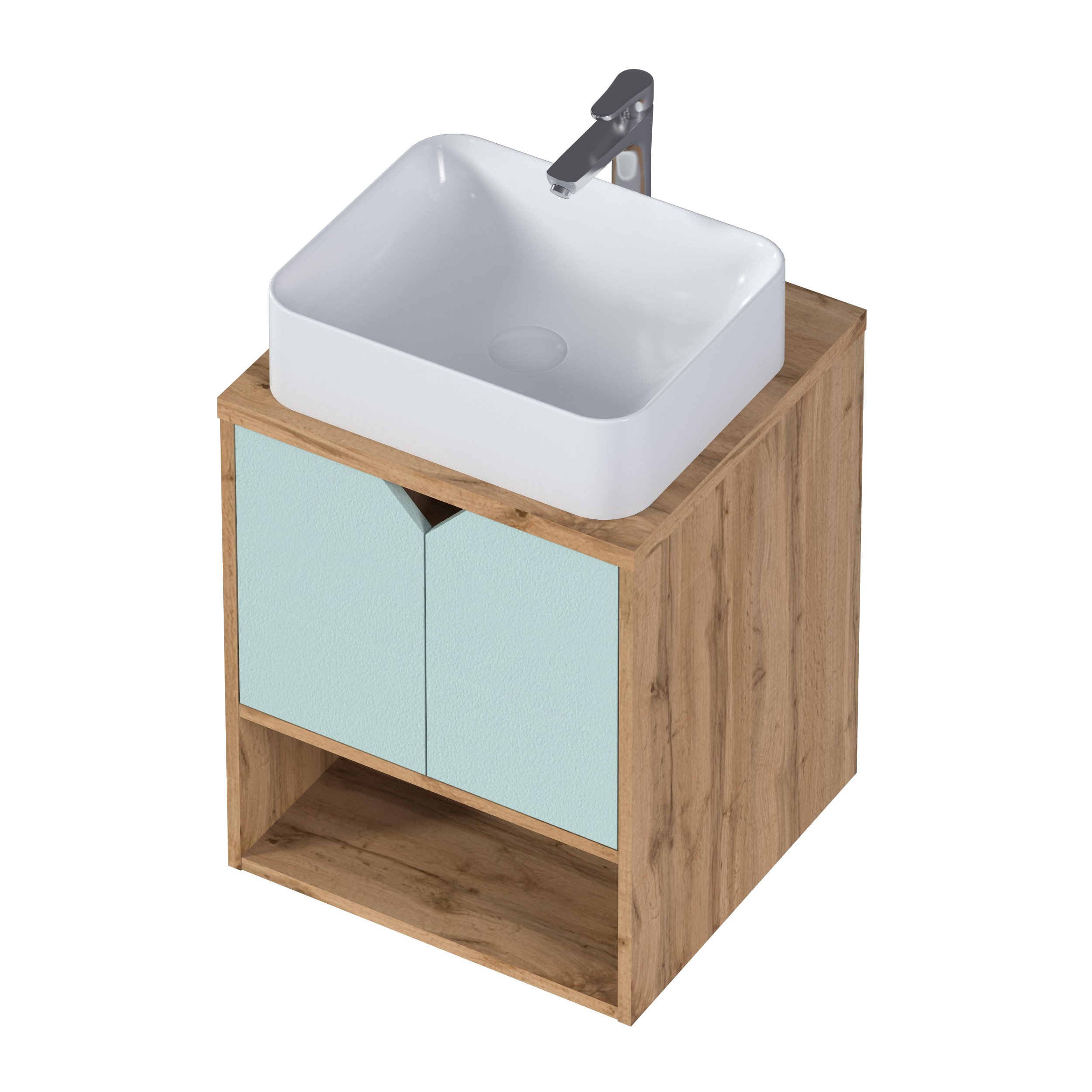 • Материал фасада – МДФ, облицованная матовой пленкой ПВХ, светлый деревянный корпус из влагостойкой ЛДСП. Благодаря этому тумба надолго сохранит первозданный вид в условиях повышенной влажности ванной комнаты.