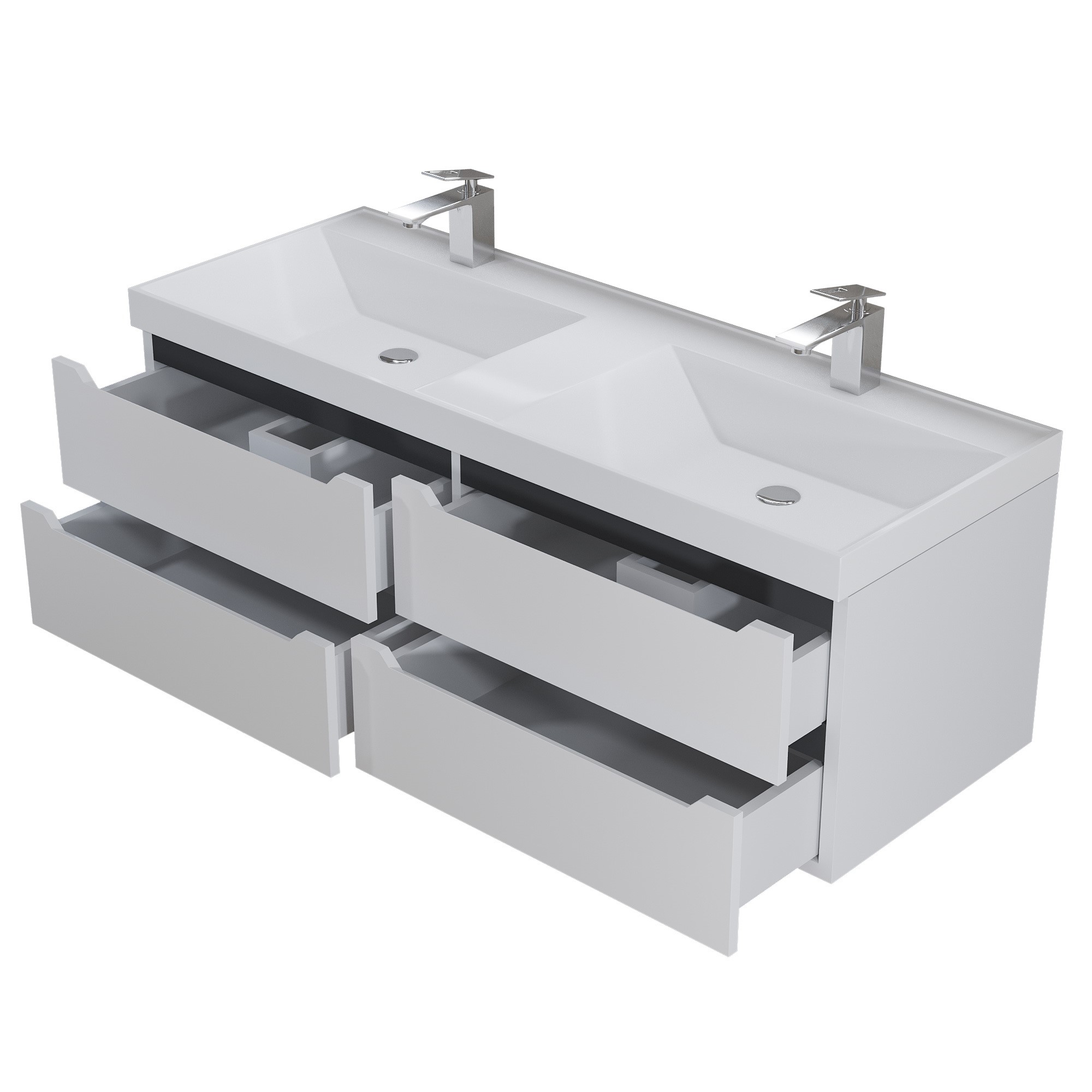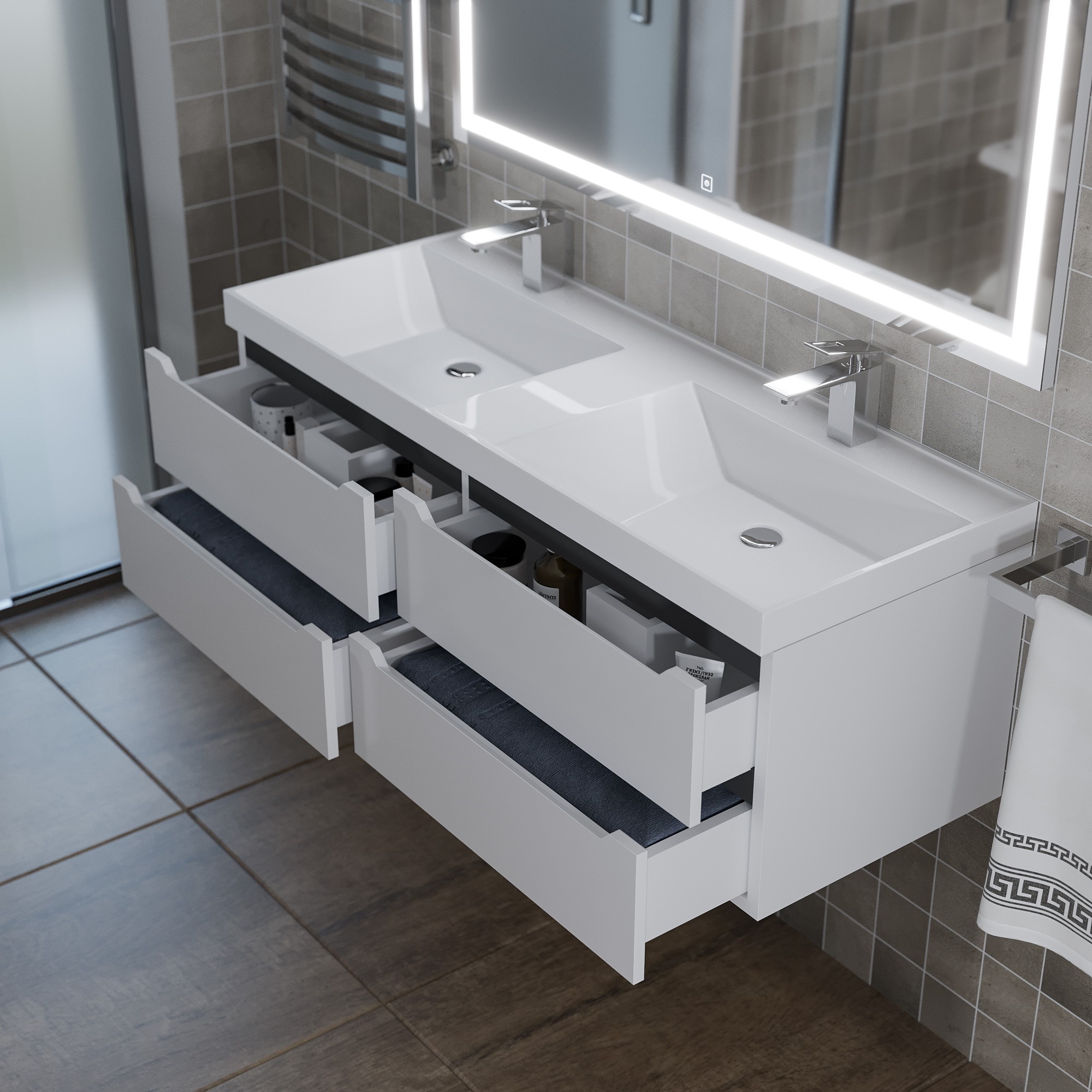 Вместительная подвесная тумба для ванной комнаты Uperwood Tanos под раковину с двумя чашами Uperwood Classic 120 см имеет 4 выдвижных ящика и представляет собой функциональное, надежное и практичное решение, которое отлично впишется в любой современный дизайн ванной комнаты.