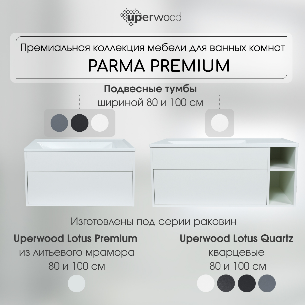 Коллекция тумб представлена в двух размерах под раковины Uperwood Lotus и Uperwood Lotus Quartz 80 и 100 см шириной.