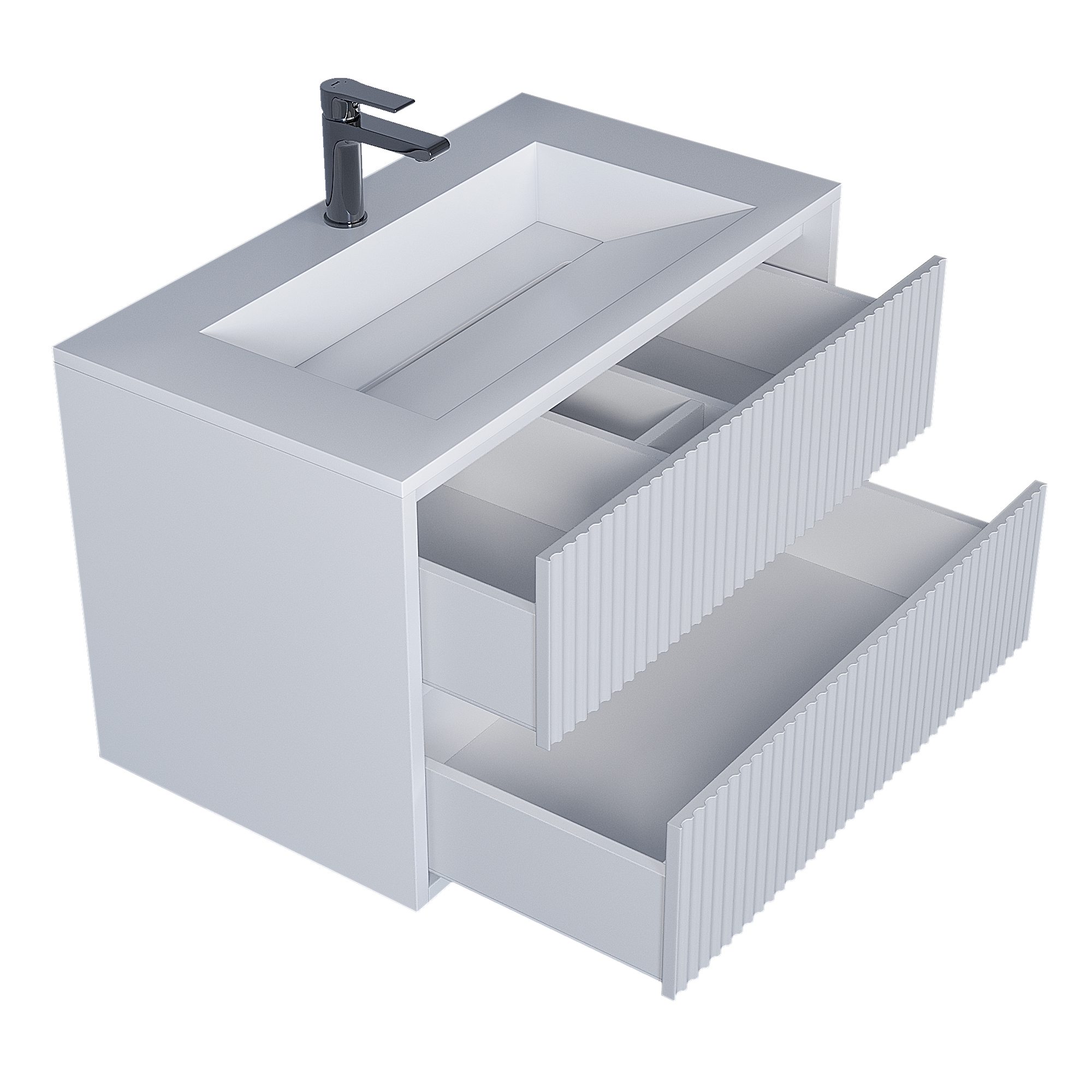Выдвижные ящики изготовлены из влагостойкой ЛДСП. Ящики оснащены доводчиками. Вся фурнитура и доводчики премиум-класса.