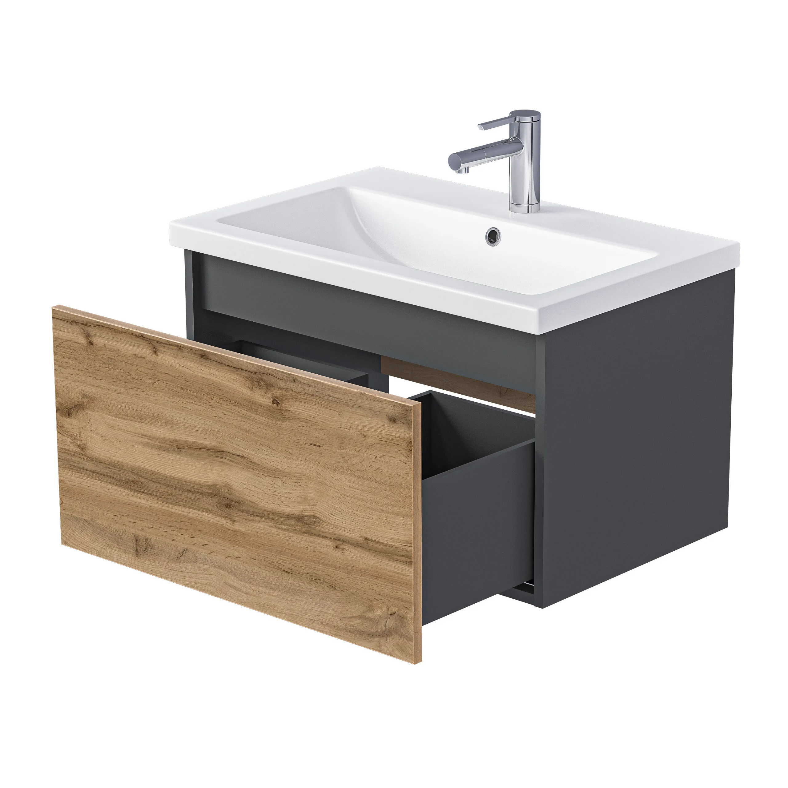 Тумба Aris mini – стильный и простой дизайн модели призван создавать уютное пространство в ванной комнате. Она представлена в двух размерах и благородных цветах: теплый древесный оттенок фасада и глубокий темно-серый корпус.