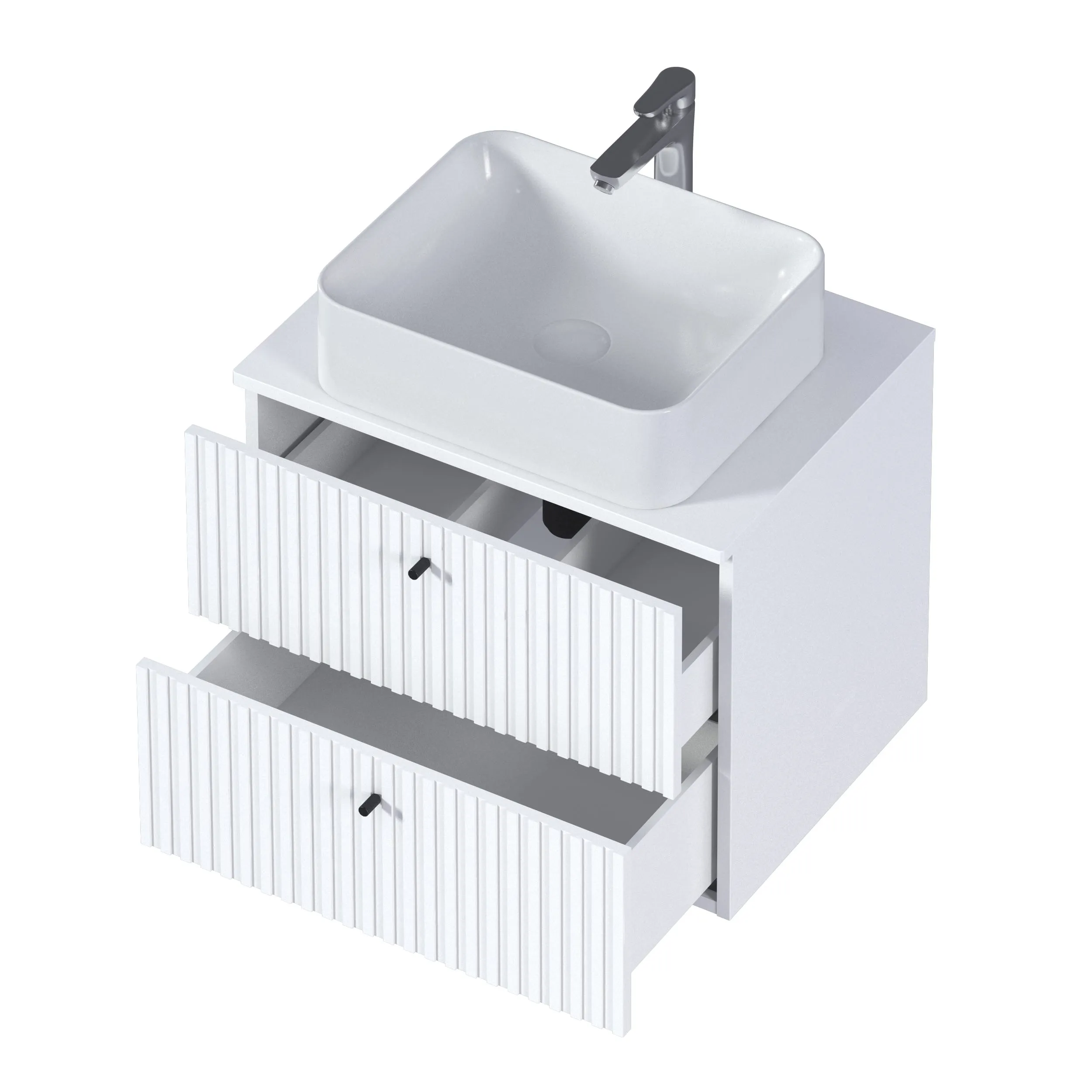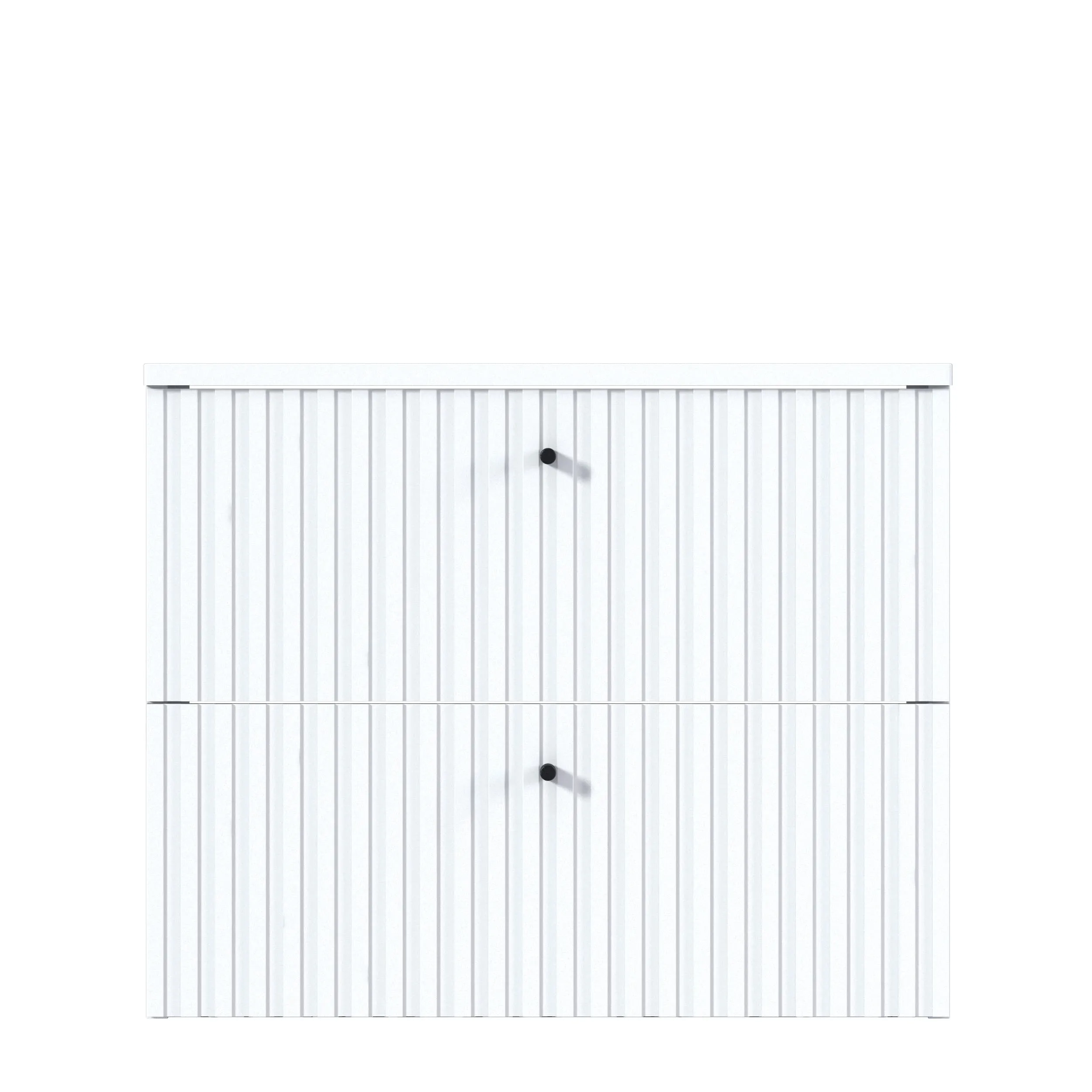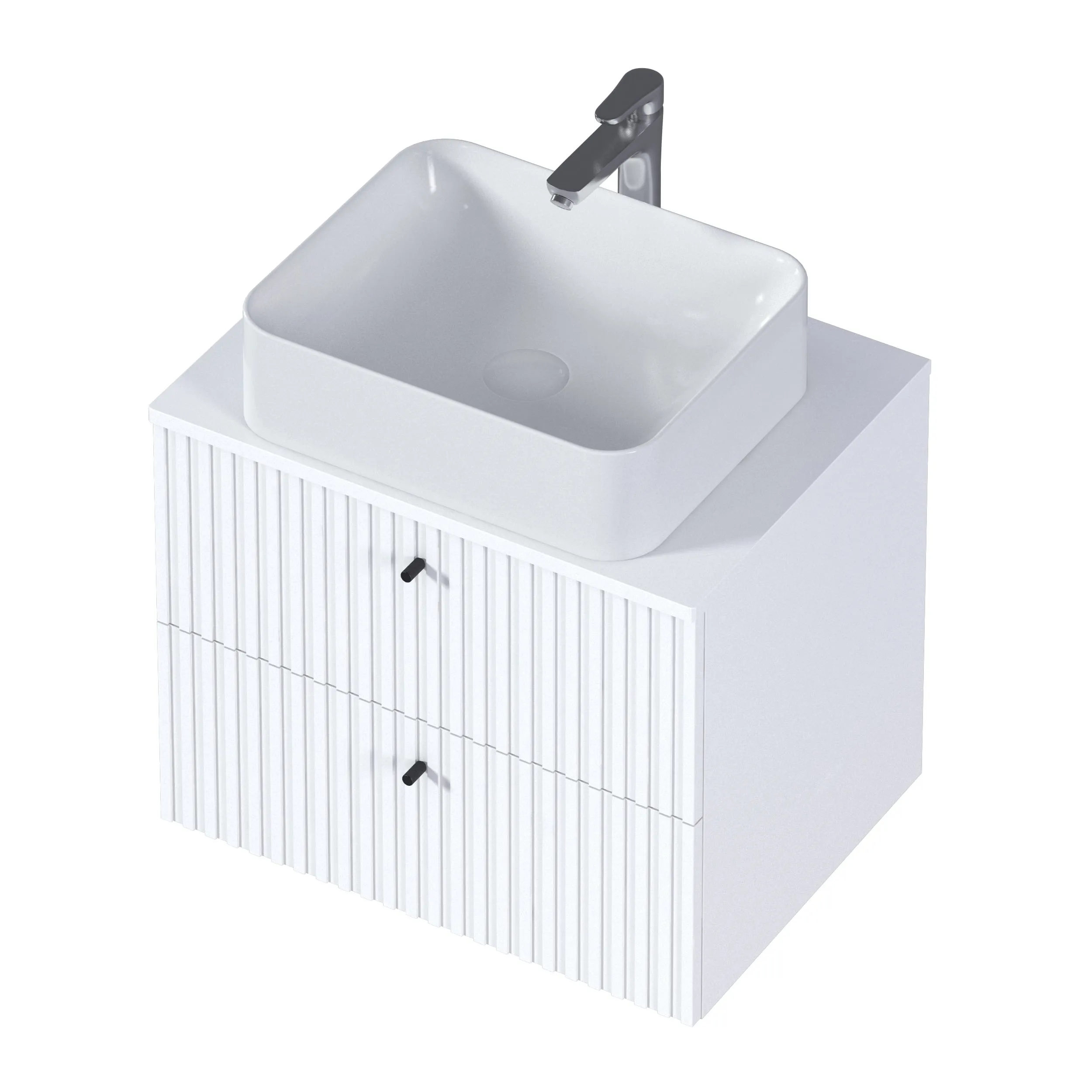 Тумба Desire – изящное решение для интерьера ванной комнаты. Рельефный фасад создает ритмичную игру света и теней. Черные ручки-кнопки контрастируют с белым фасадом и подчеркивают её современный дизайн.
