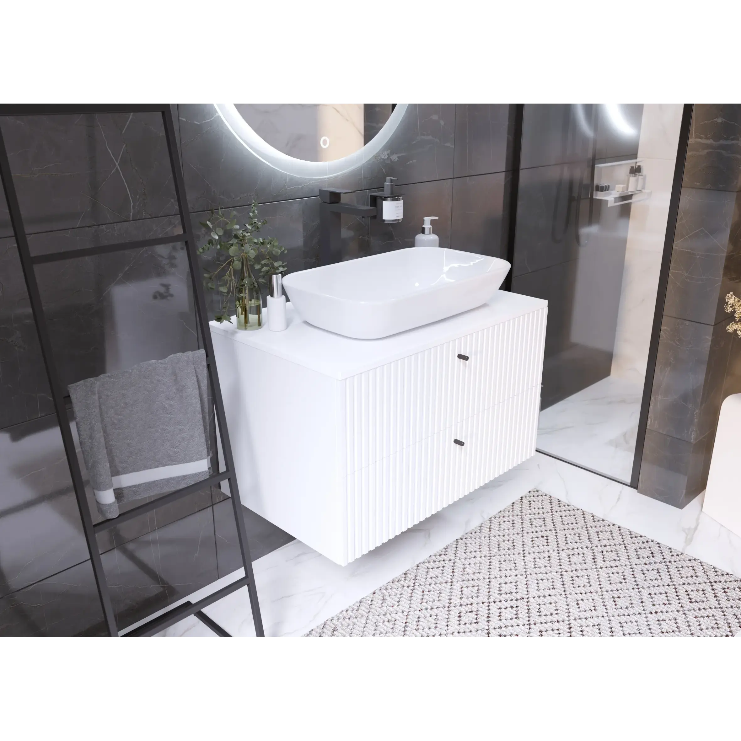 Тумба Desire – изящное решение для интерьера ванной комнаты. Рельефный фасад создает ритмичную игру света и теней. Черные ручки-кнопки контрастируют с белым фасадом и подчеркивают её современный дизайн.