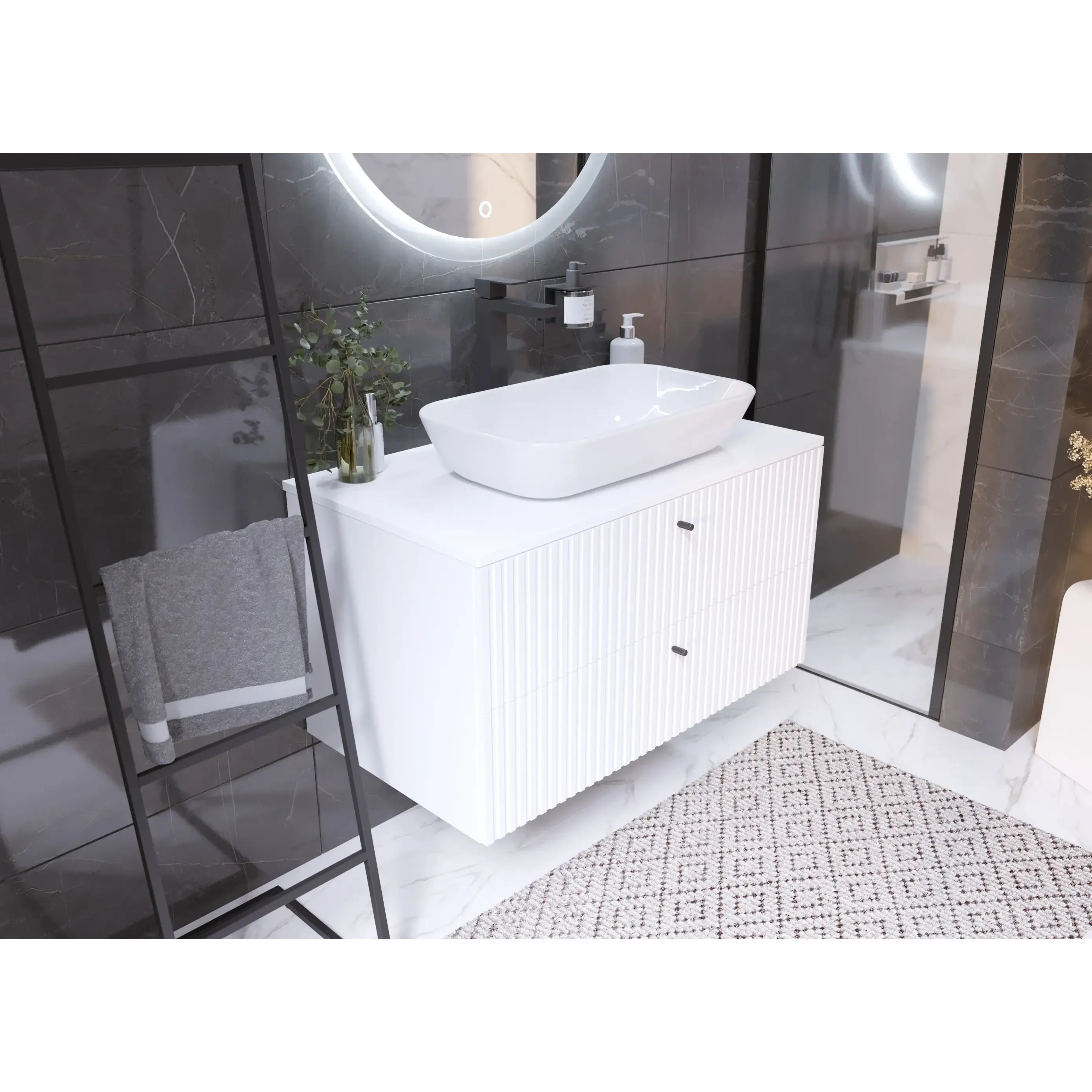 Тумба Desire – изящное решение для интерьера ванной комнаты. Рельефный фасад создает ритмичную игру света и теней. Черные ручки-кнопки контрастируют с белым фасадом и подчеркивают её современный дизайн.