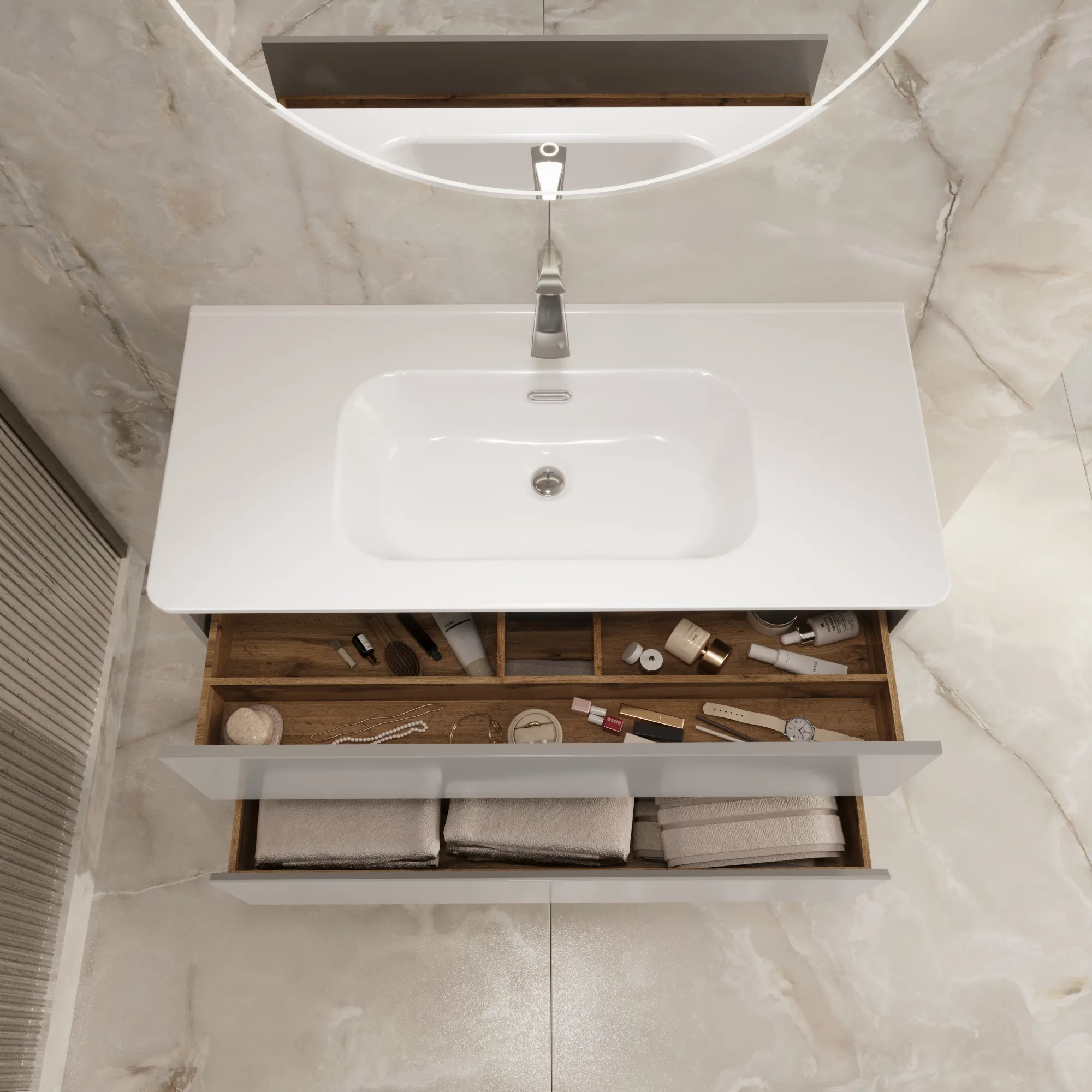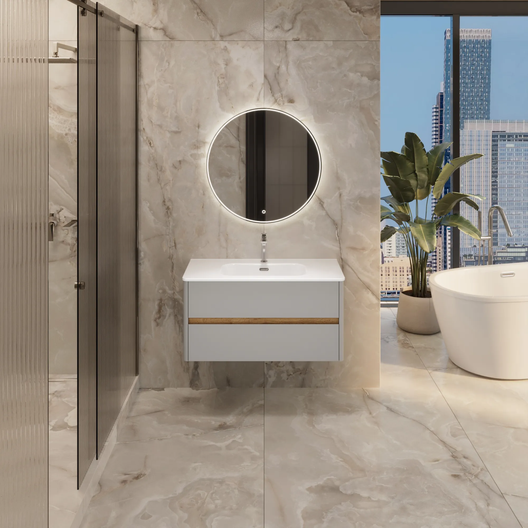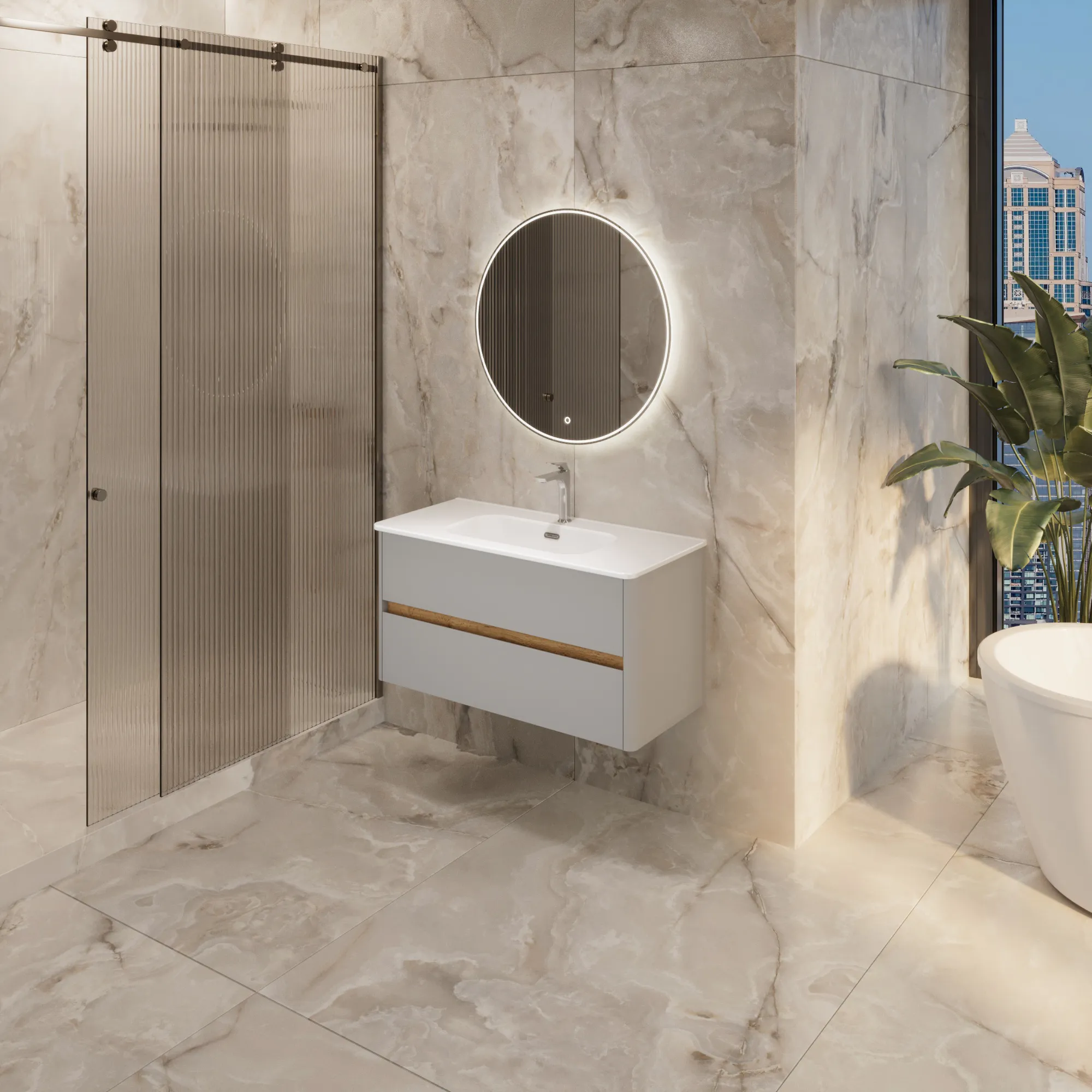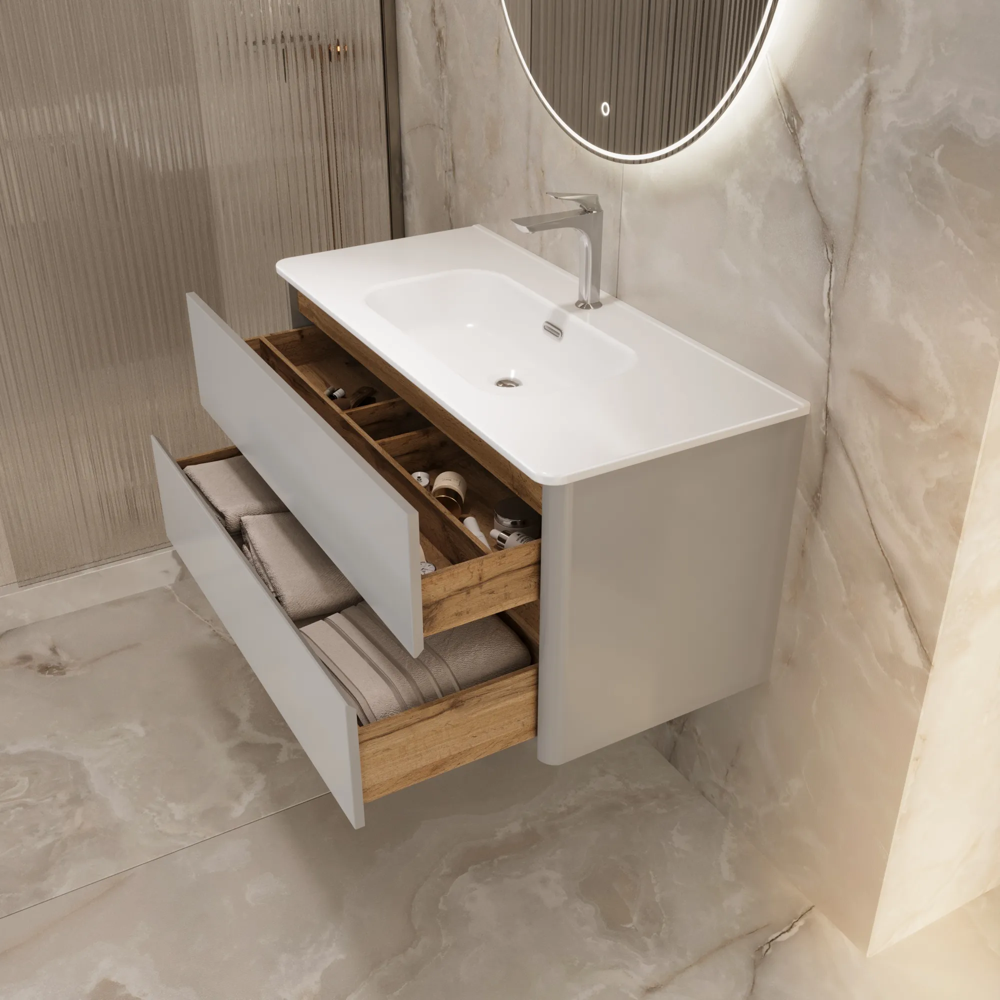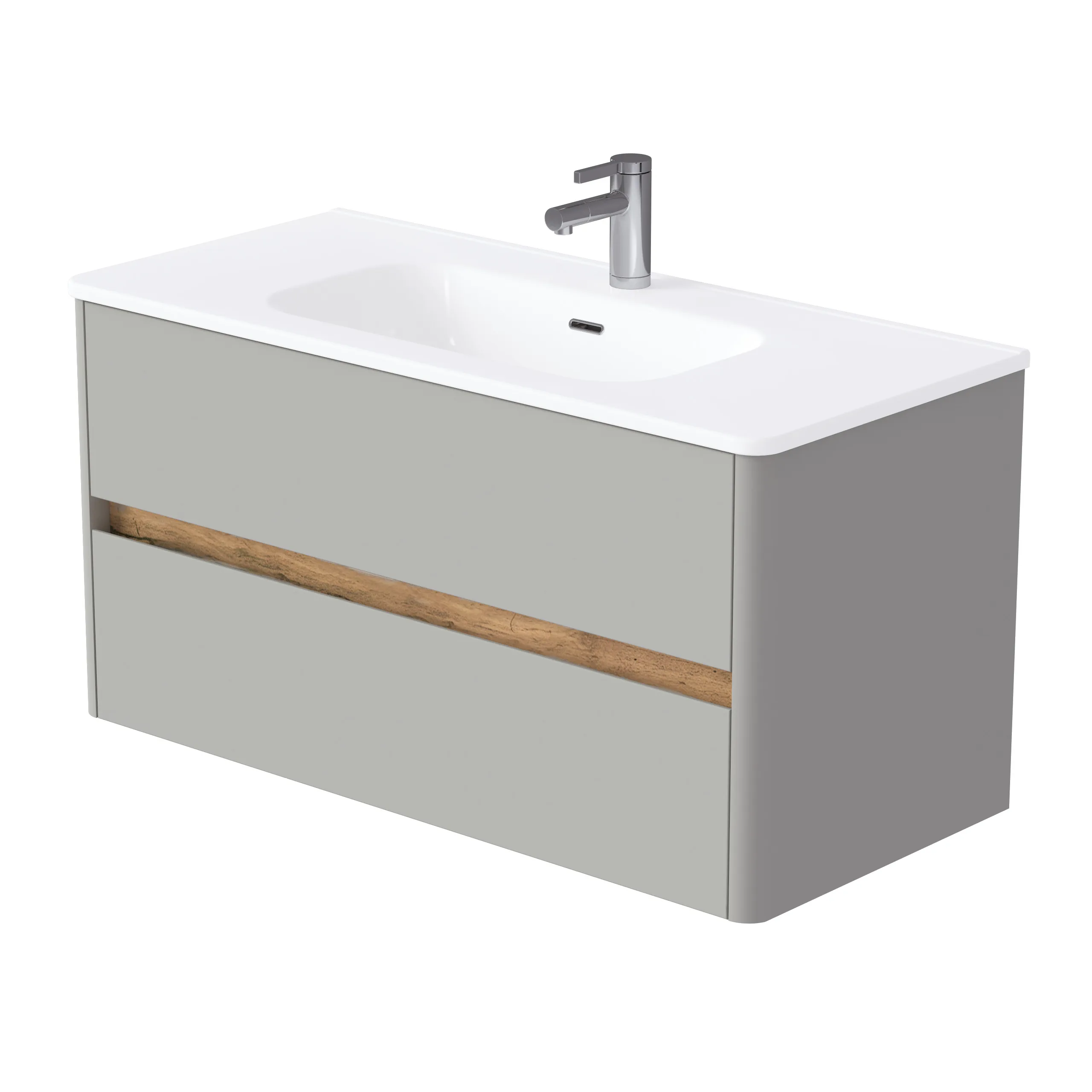 Матовый фасад, интегрированные ручки, керамическая раковина* с широкими бортами для хранения и полки в тон теплому дереву придают интерьеру изящность и подчеркивают его уникальный характер.