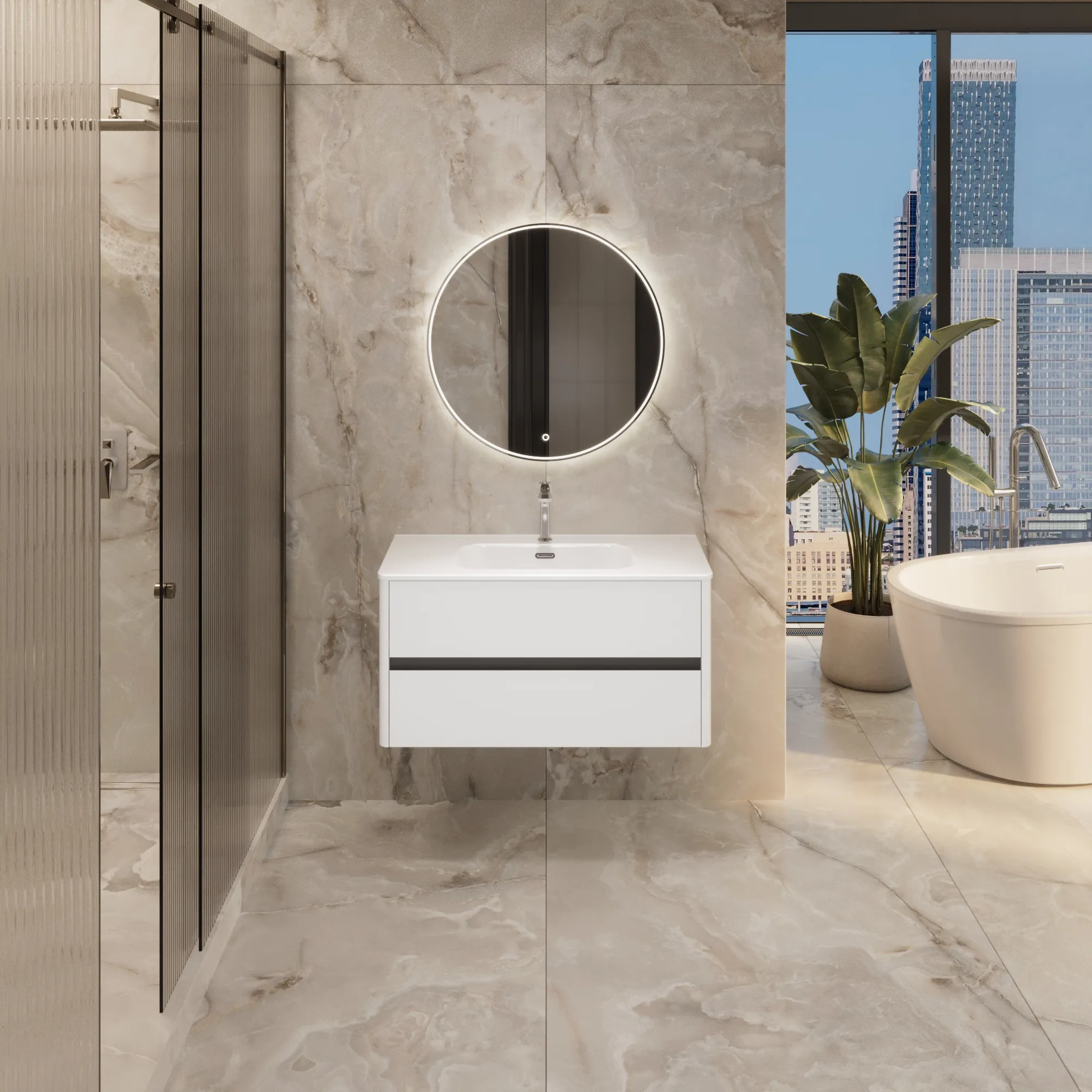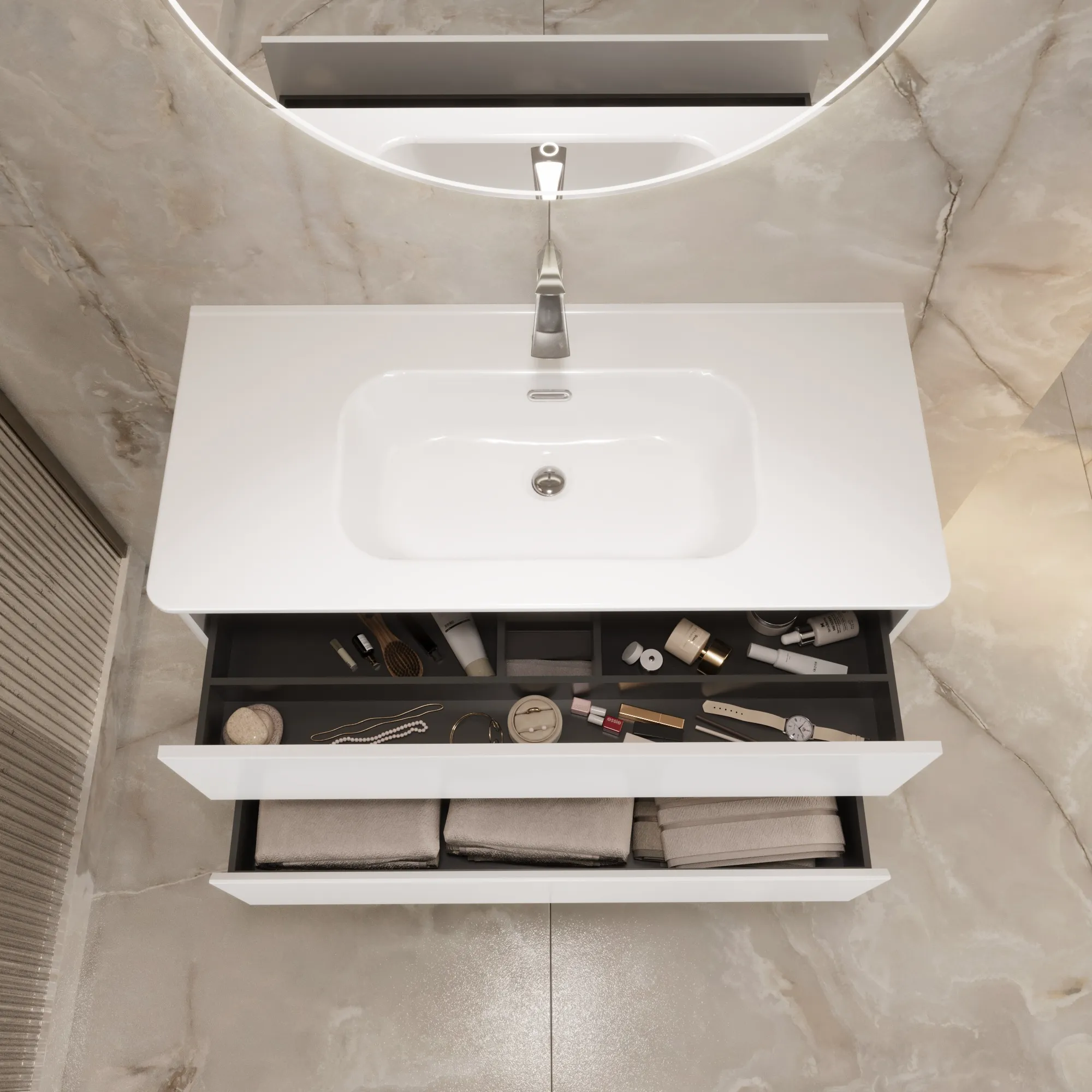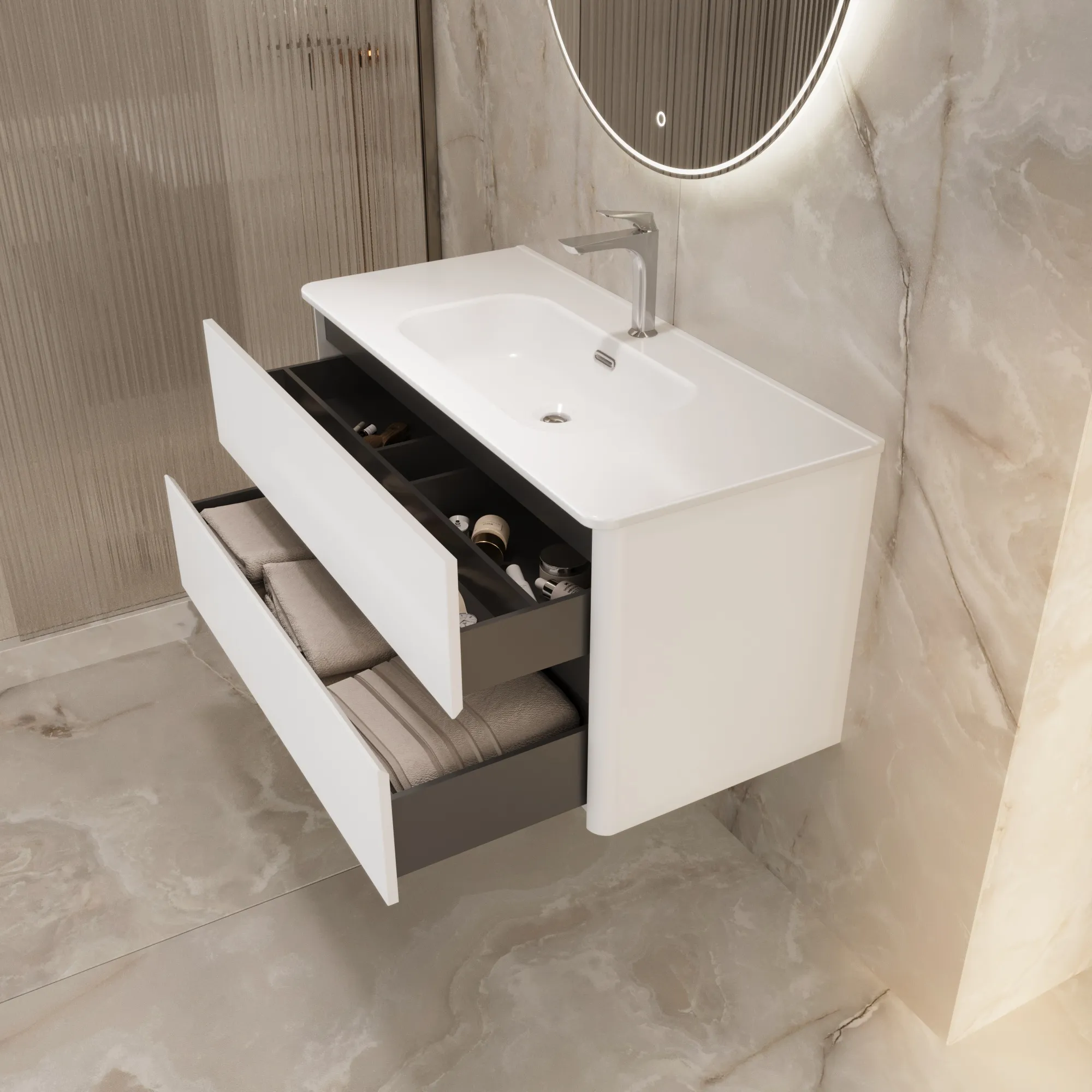 • Материал корпуса и фасада – МДФ, покрытый итальянской матовой эмалью. Благодаря этому тумба сохранит первозданный вид на долгие годы в условиях повышенной влажности.