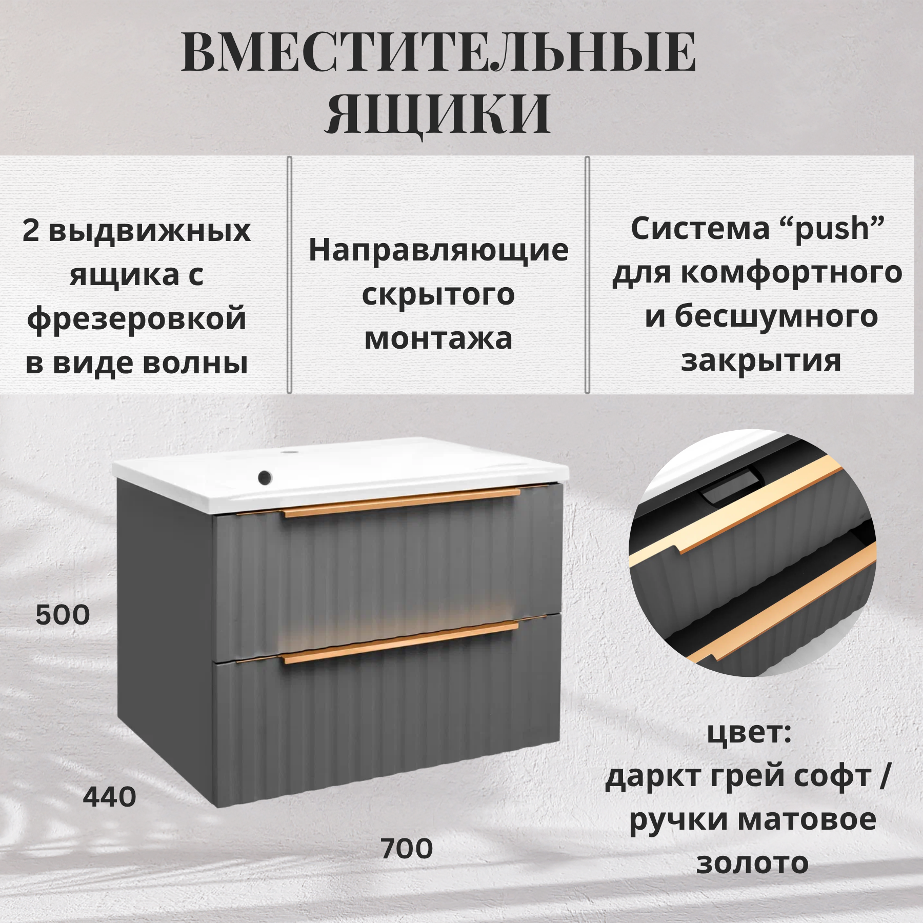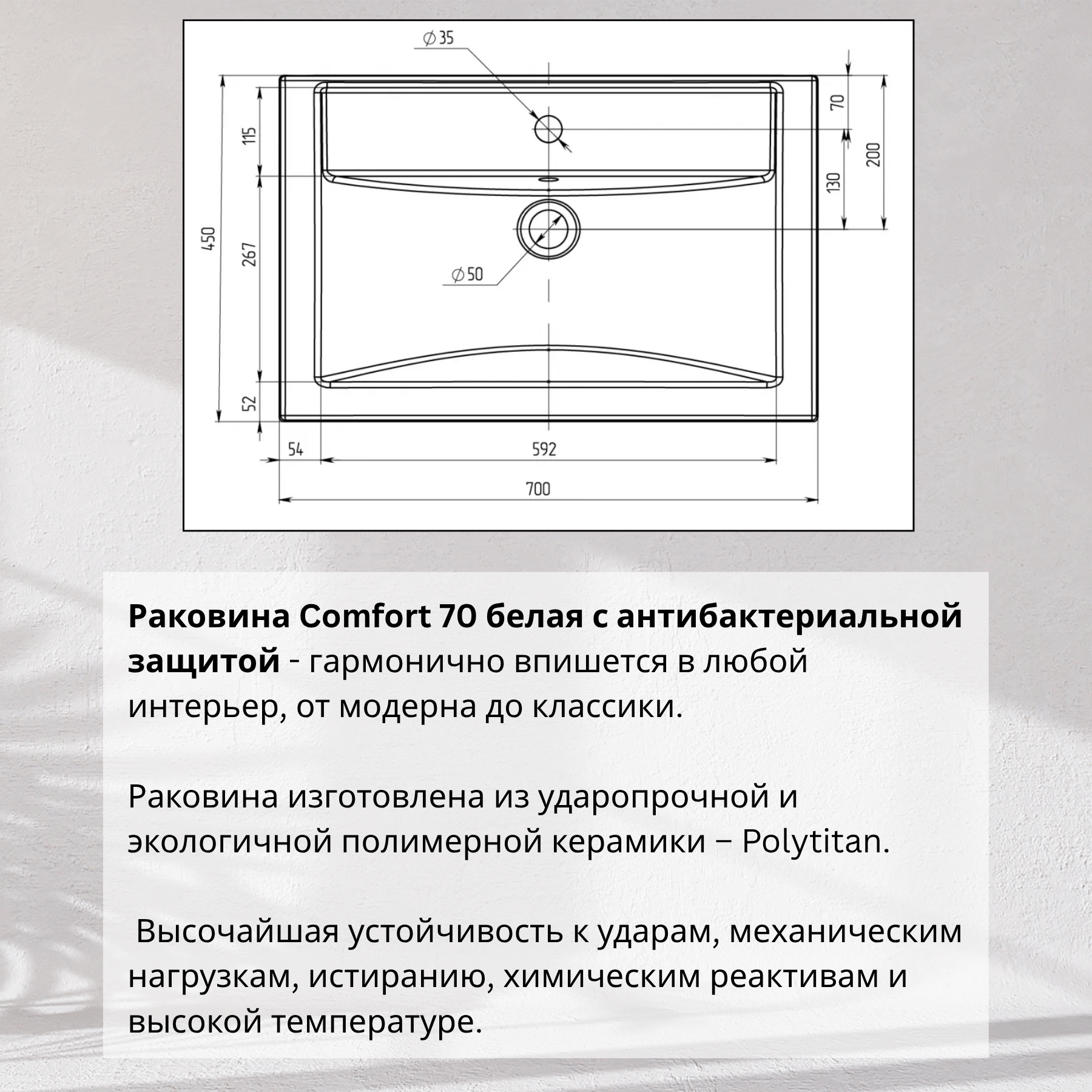 Тумба с раковиной выполнена в популярном размере 70 см, что позволяет уместить ее в любом пространстве — от компактных до более просторных ванных комнат.
