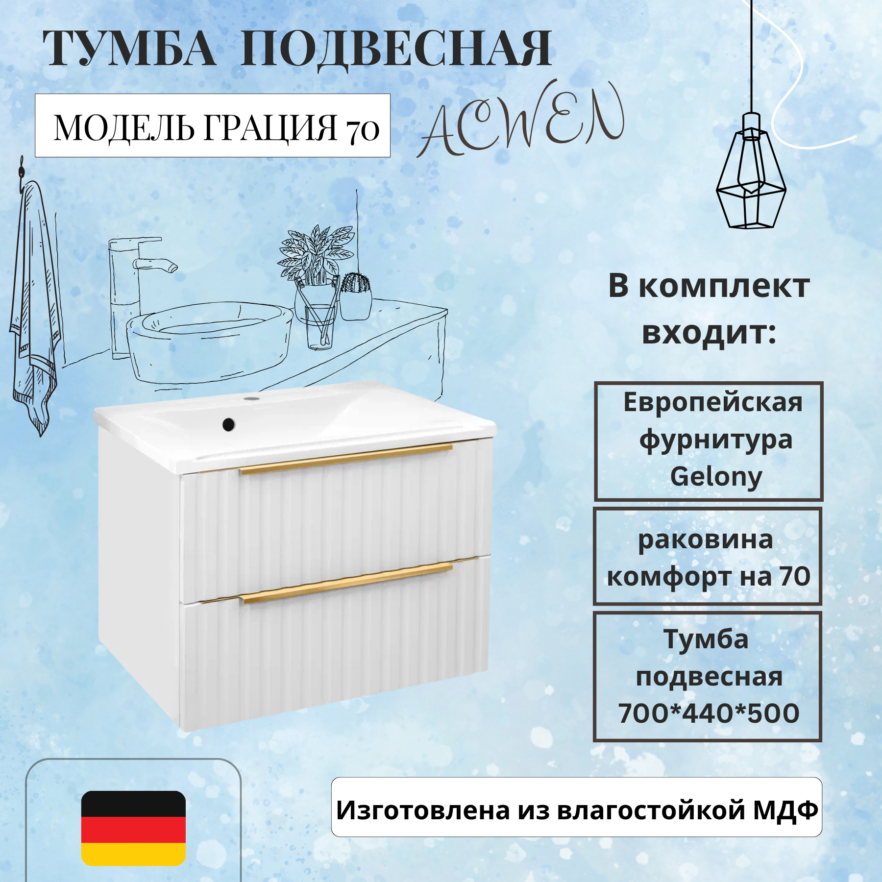 Тумба с раковиной выполнена в популярном размере 70 см, что позволяет уместить ее в любом пространстве — от компактных до более просторных ванных комнат.