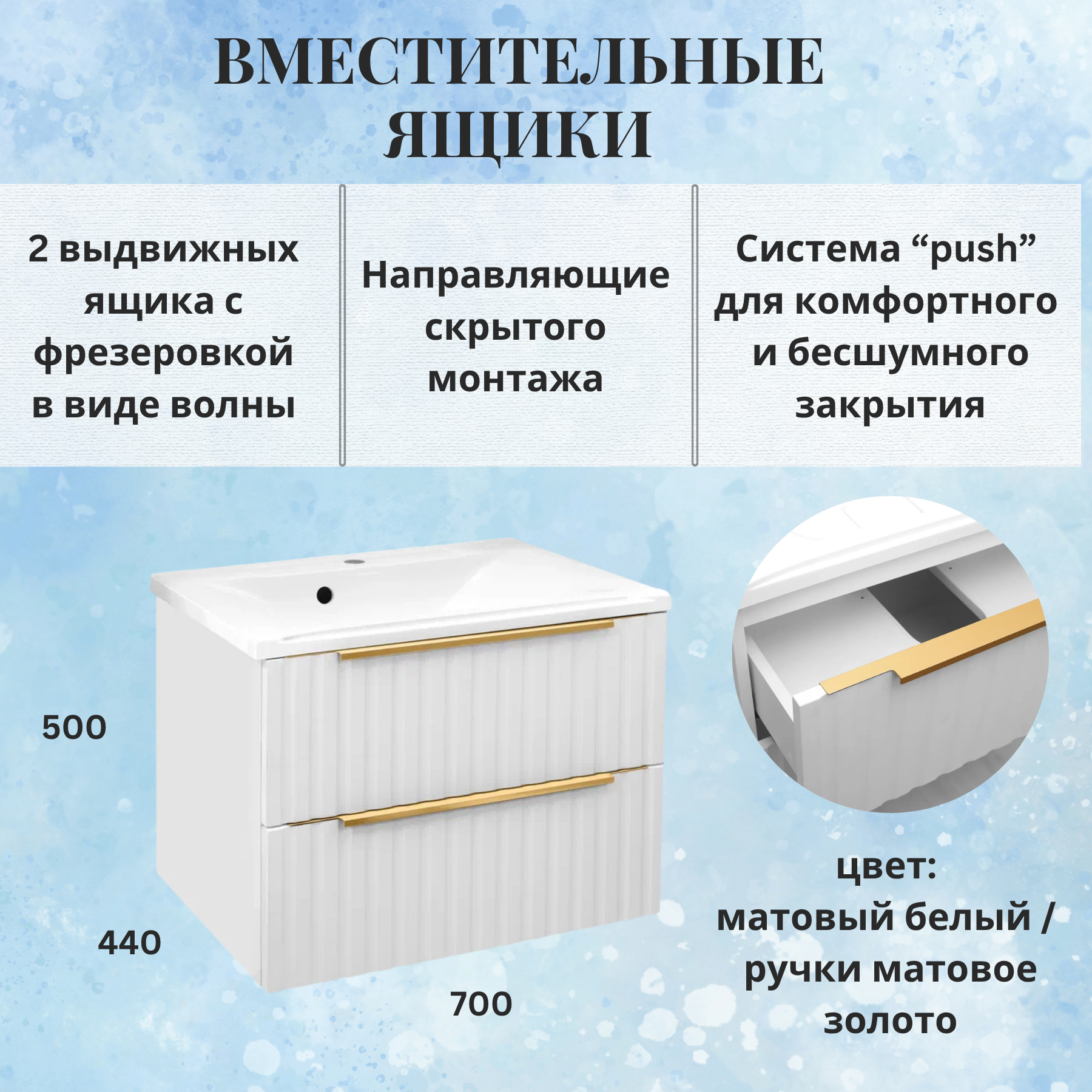 Удобные выдвижные ящики обеспечивают достаточно места для хранения туалетных принадлежностей, полотенец и других аксессуаров. Ящики открываются плавно и бесшумно.