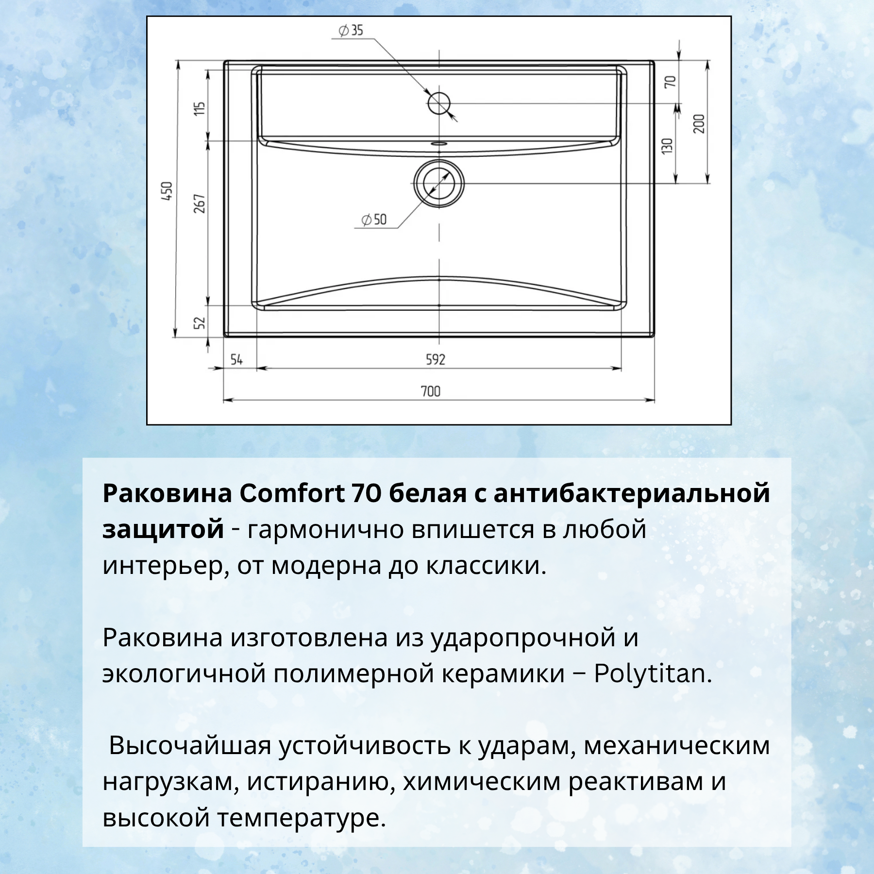 Тумба с раковиной выполнена в популярном размере 70 см, что позволяет уместить ее в любом пространстве — от компактных до более просторных ванных комнат.