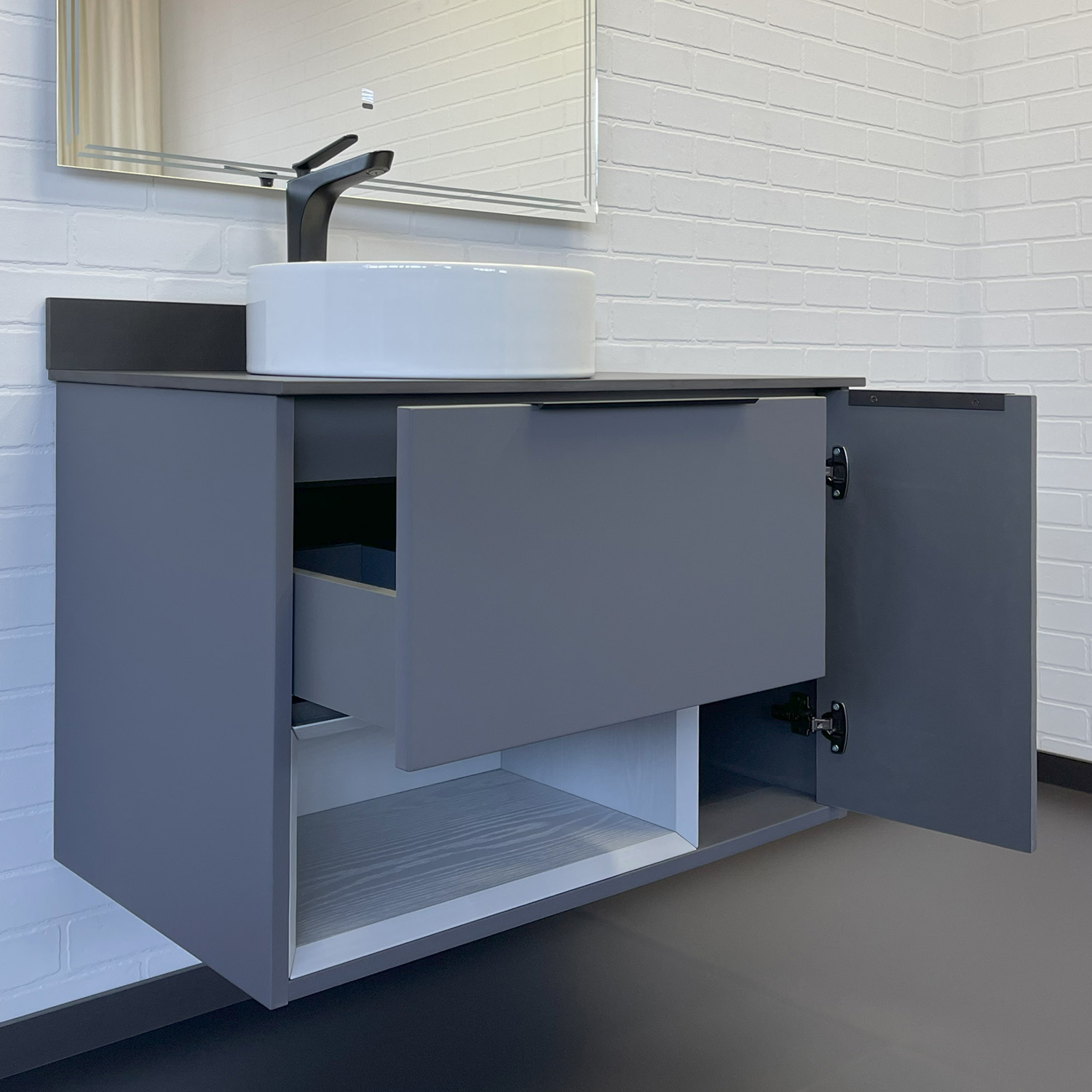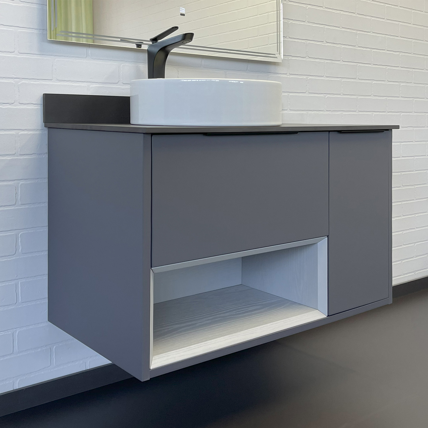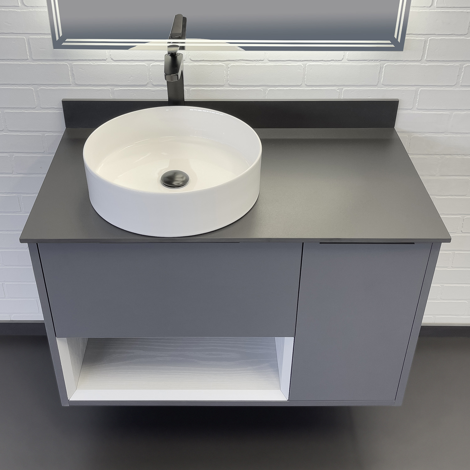 Комплектация: круглая керамическая раковина Comforty 9111 Подвесная тумба с одним ящиком и створкой оборудованными системой плавного закрывания. Предусмотрено пространство для открытого хранения. На фасадах тумбы черные матовые алюминиевые ручки. Прямоугольная раковина-чаша установлена на столешницу из керамогранита. В комплекте также пристенный плинтус. Ниша открытого хранения сделана из МДФ в пленке серого цвета с текстурой дерева. Торцы вставки спилены под углом.