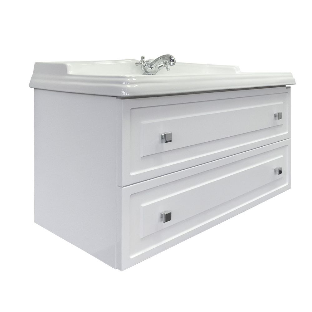Подвесная тумба-умывальник с двумя широкими выкатными ящиками с направляющими оснащенными системой плавного закрывания. Фасады выполнены из МДФ и покрыты белой глянцевой эмалью. Широкая раковина столешница с овальной чашей и оригинальными отверстиями перелива. Цвет: белый глянец Комплектация: керамическая раковина Comforty 3310 Тумба подготовлена для подключения водоснабжения снизу.