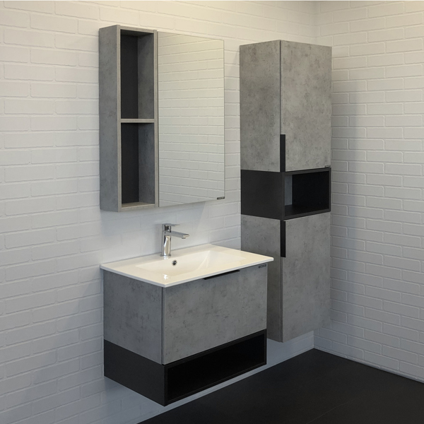 Тумба-умывальник в современном стиле с выкатным ящиком и пространством для открытого хранения. Ящик оснащен системой плавного закрывания. Тумба укомплектована черной матовой алюминиевой ручкой и накладной прямоугольной раковиной из санфарфора. Тумба подготовлена для подключения водоснабжения снизу.