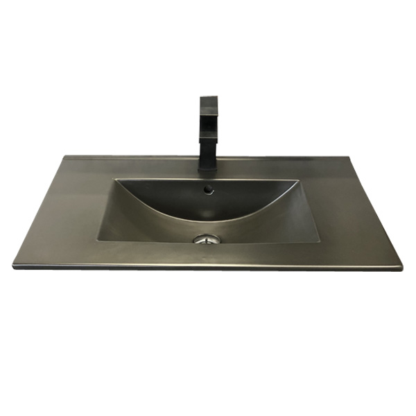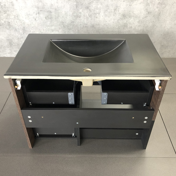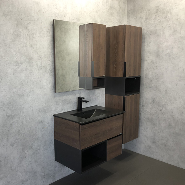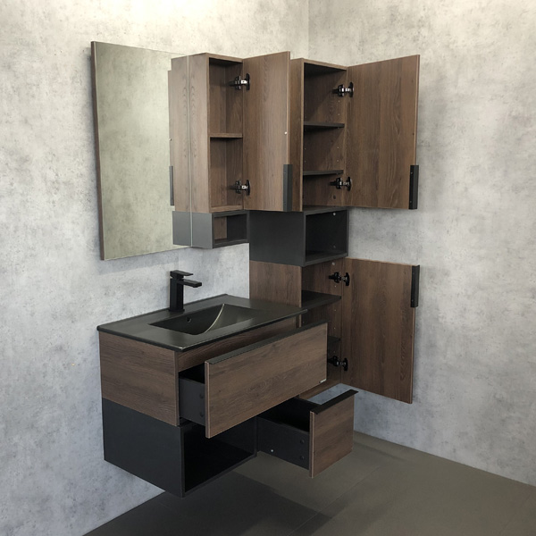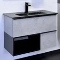 Тумба-умывальник в современном стиле с выкатным ящиком и пространством для открытого хранения. Ящик оснащен системой плавного закрывания. Тумба укомплектована черной матовой алюминиевой ручкой и накладной прямоугольной раковиной из санфарфора. Тумба подготовлена для подключения водоснабжения снизу.