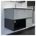 Тумба-умывальник в современном стиле с выкатным ящиком и пространством для открытого хранения. Ящик оснащен системой плавного закрывания. Тумба укомплектована черной матовой алюминиевой ручкой и накладной прямоугольной раковиной из санфарфора. Тумба подготовлена для подключения водоснабжения снизу.