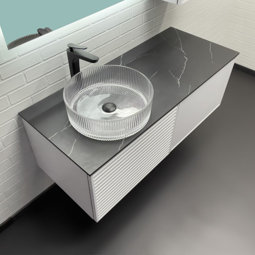 Комплектация: накладная раковина Comforty CF21001 из закаленного стекла, столешница из керамогранита Калакатта Блэк. Подвесная тумба-умывальник с одним выкатным ящиком и створкой, система открывания при нажатии push-to-open. Фасад ящика декорирован горизонтальными профильными пазами. Створка и фасад окрашены белой матовой эмалью. Тумба подготовлена для подключения водоснабжения снизу и сзади.