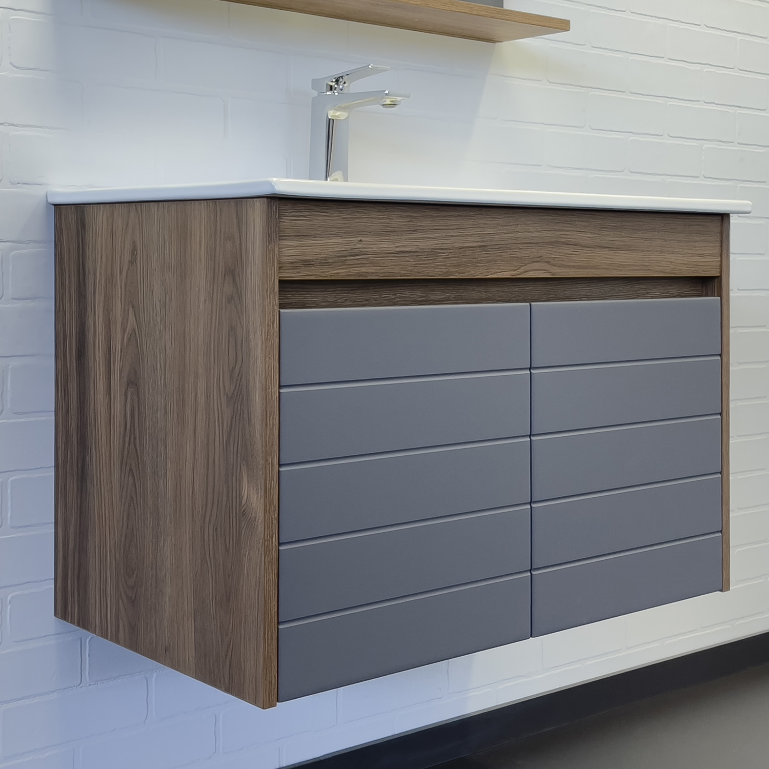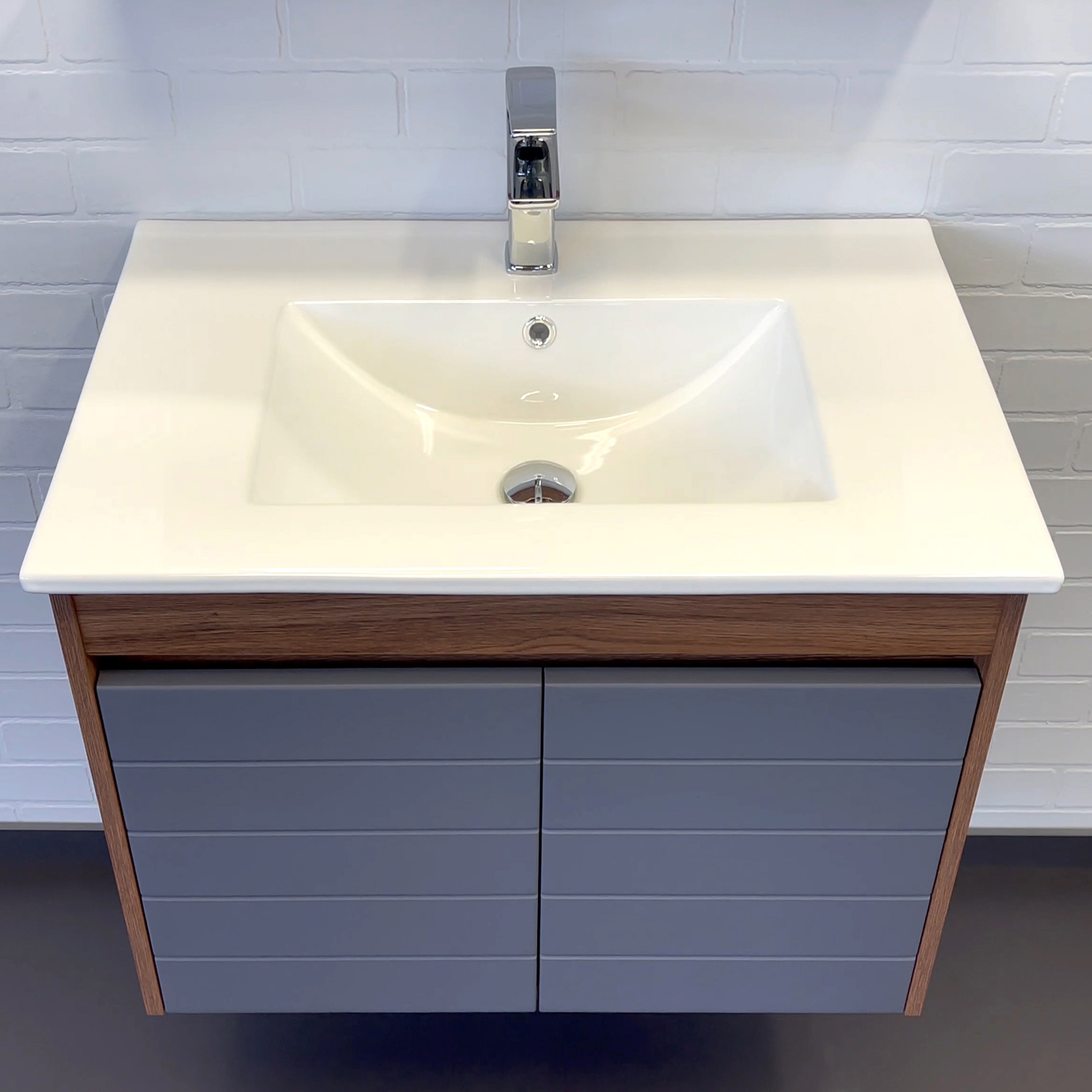 Комплектация: керамическая раковина Comforty 75E (санфарфор) Подвесная тумба-умывальник с двумя распашными створками, оснащенными петлями с системой плавного закрывания. Фасад тумбы из МДФ украшен горизонтальным узором и обтянут в пленку цвета антрацит.