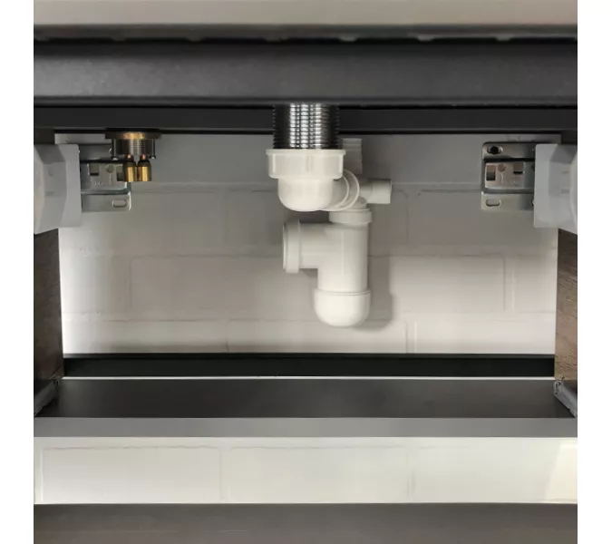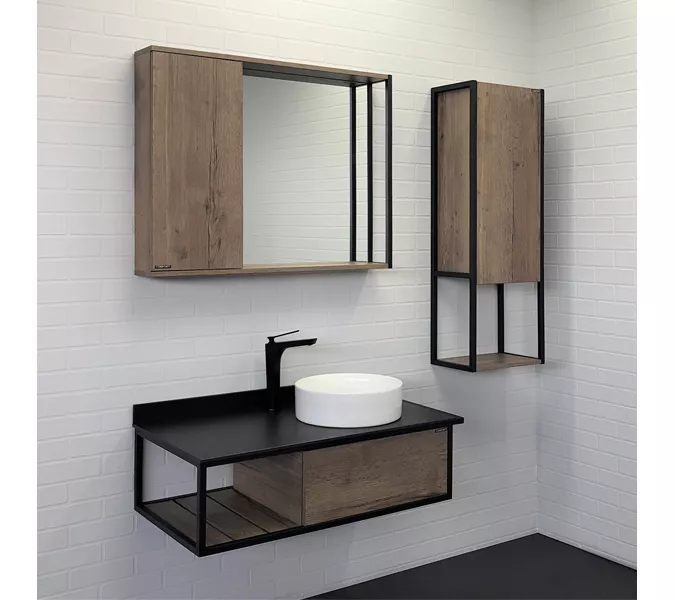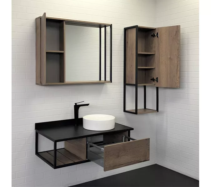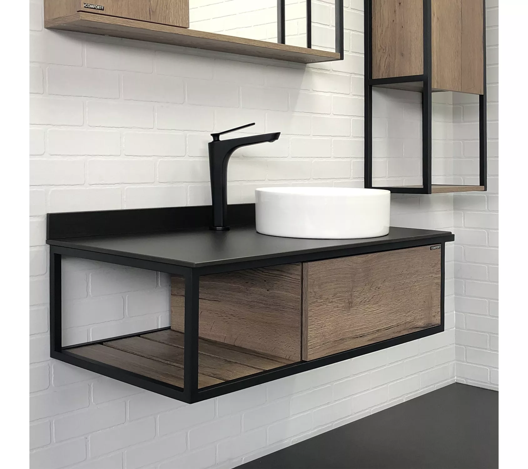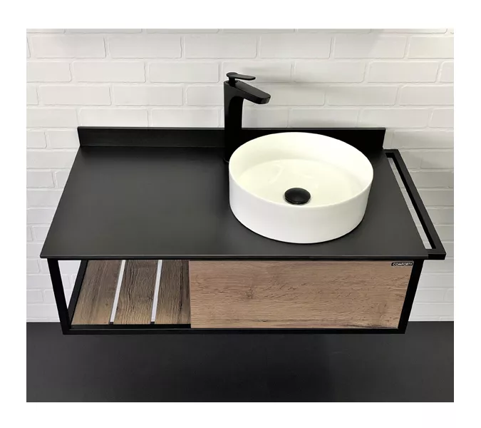 Подвесная консольная тумба-умывальник в стиле лофт. В основе тумбы - каркас из стального профиля окрашенный в цвет черный муар. В каркас интегрирован боковой полотенцедержатель. Керамическая круглая раковина чаша установлена слева на столешнице из черного керамогранита. Боковые стенки и фасад ящика изготовлены из влагостойкого ЛДСП цвета Дуб темный. Ящик тумбы оборудован механизмом push-to-open - открытие при нажатии.